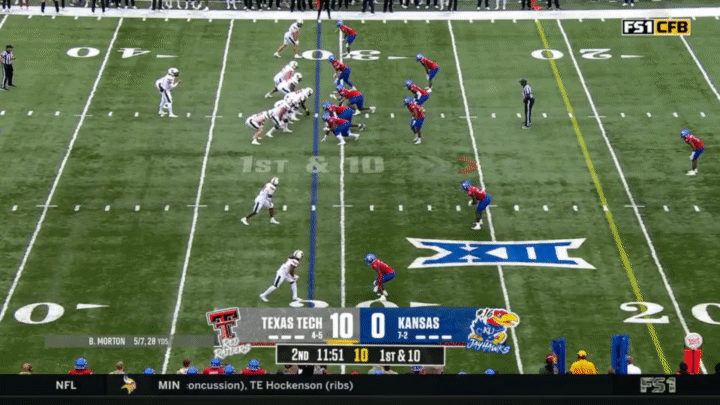Morton’s tendency to stare down his first read cost him against the better defenses of the conference. Here you can see the Kansas safety reading Morton’s eyes before jumping the route for a near interception: