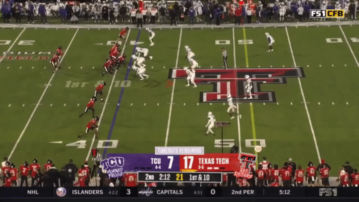 Let’s start with one of the slot receivers, Xavier White, who I felt has come on the strongest in recent weeks. Texas Tech does not often attack deep down the field, but Xavier White was able to use his speed here to get past the safety for the big catch: