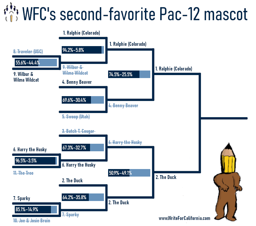 It’s the phenomenon that’s taking the internet by storm—and it’s coming to a close, to the disappointment of the threes and threes of you who are actually reading, voting, or commenting. We’re entering the final round of the WFC tournament to crown the second-best mascot of the Pac-12.