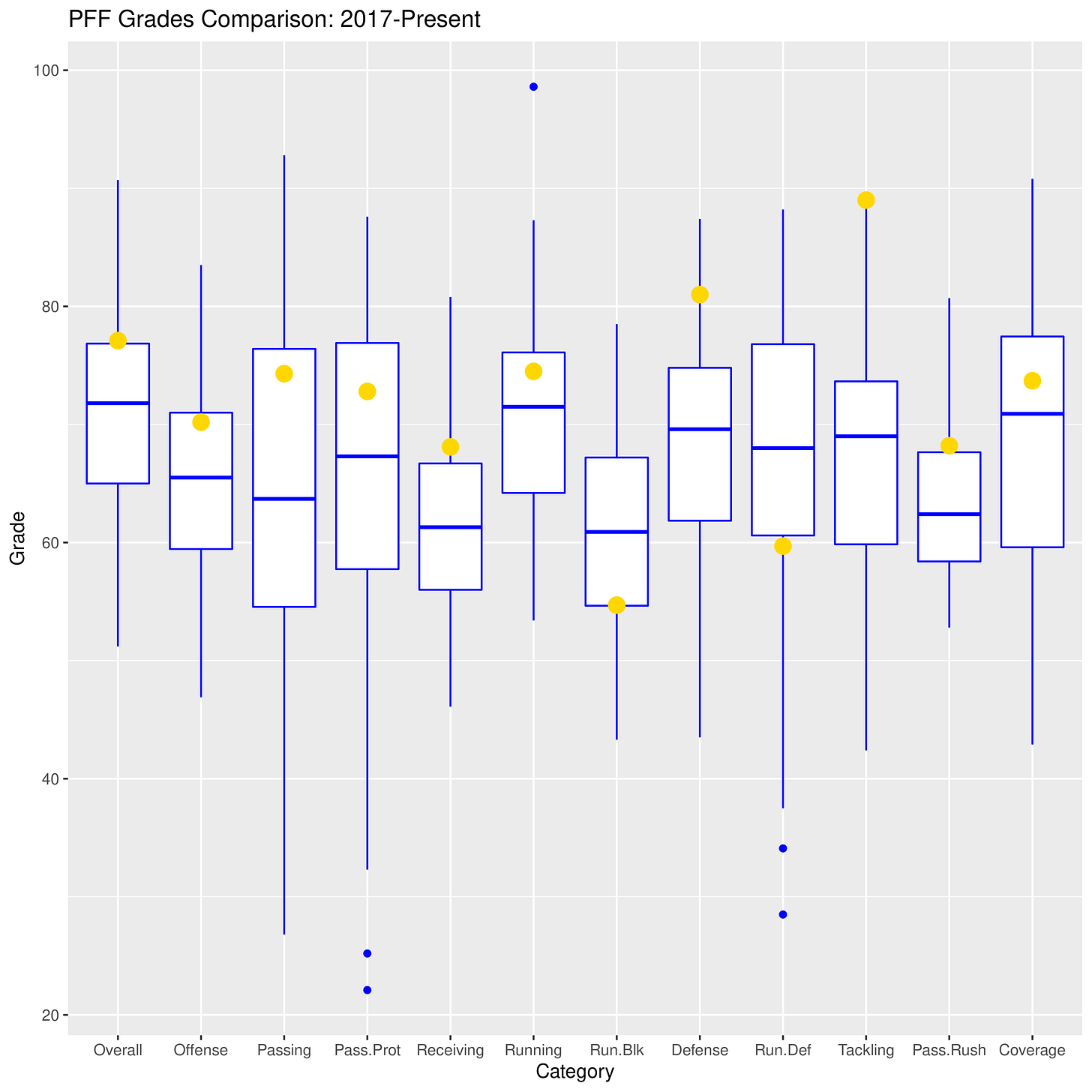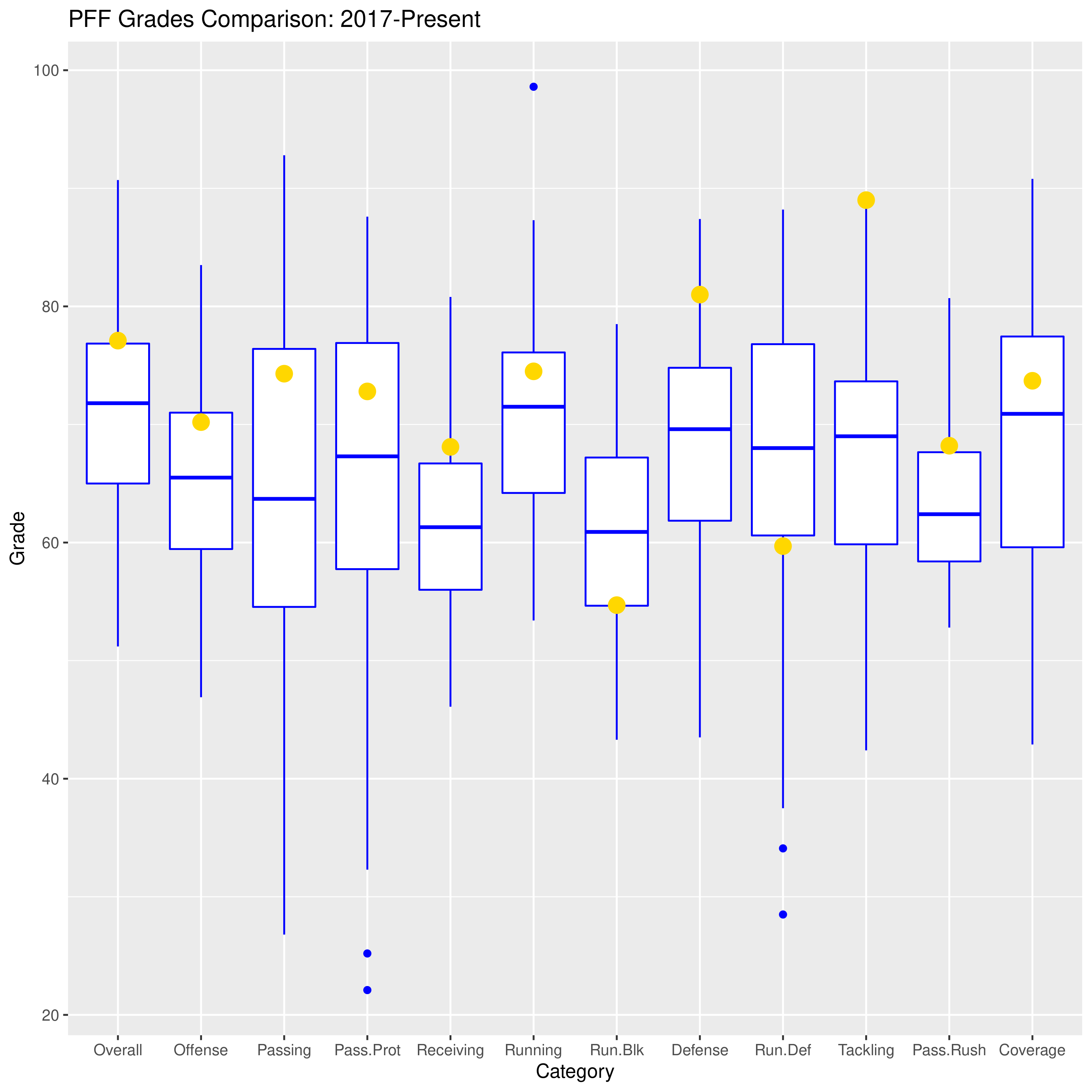 Below I have highlighted the grades from the North Texas game (gold dots) compared to the rest of the grades from the Wilcox era. I use boxplots to display the data. In case you’ve forgotten everything from Stats 2, here’s how boxplots work: there is a box that captures the middle 50% of the data, or those data points between the 25th and 75th percentiles. The horizontal line represents the median, or the exact middle of the data. The vertical lines (sometimes called whiskers) capture data near the edges of the distribution. And singular blue dots represent extreme outliers.
