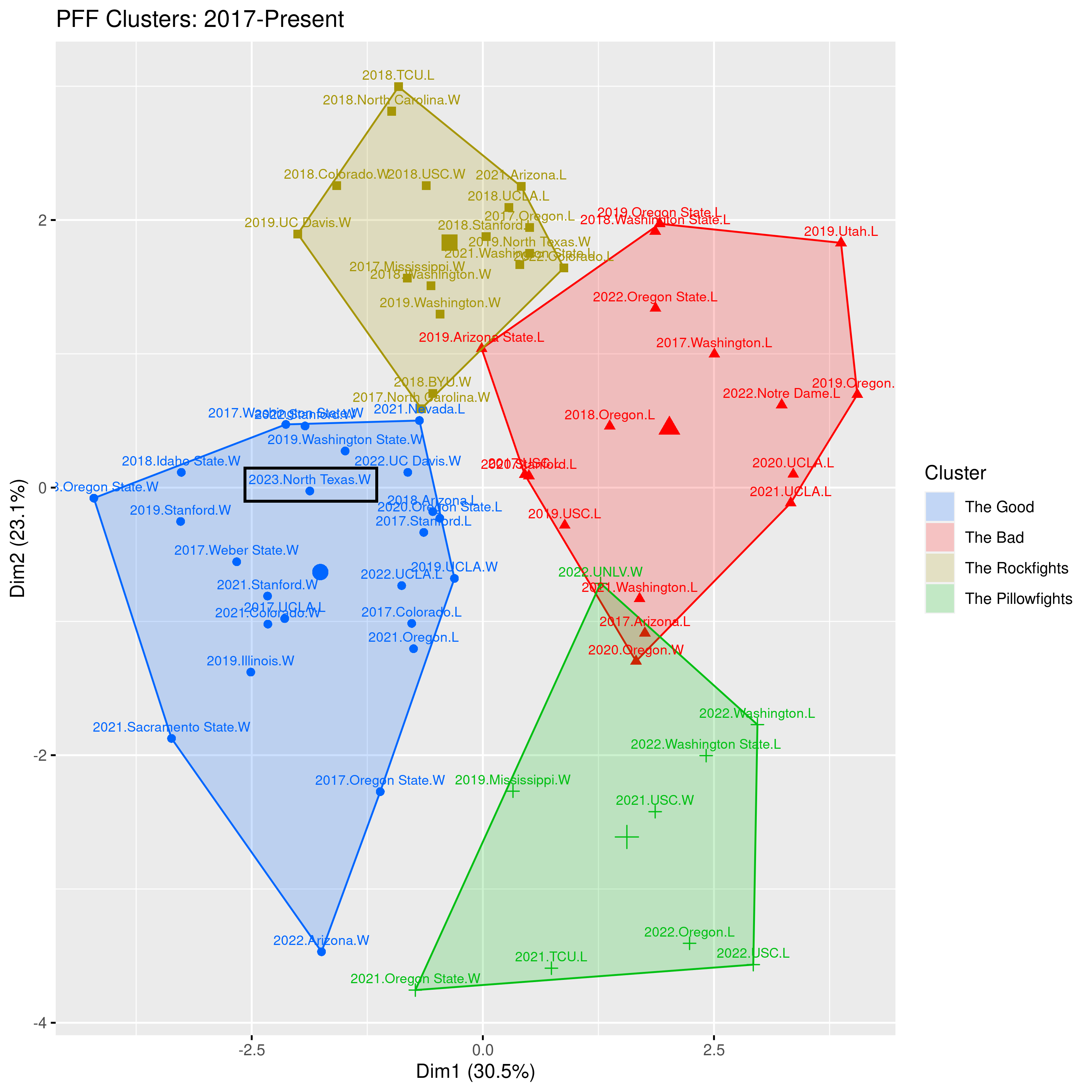 Now for the fun part: I fed the grades into the clustering algorithm to figure out which type of game it was. Unsurprisingly, this one fell into The Good. The plot below visualizes all games since 2017 and the clusters they fall into; the North Texas game is highlighted with black rectangle.