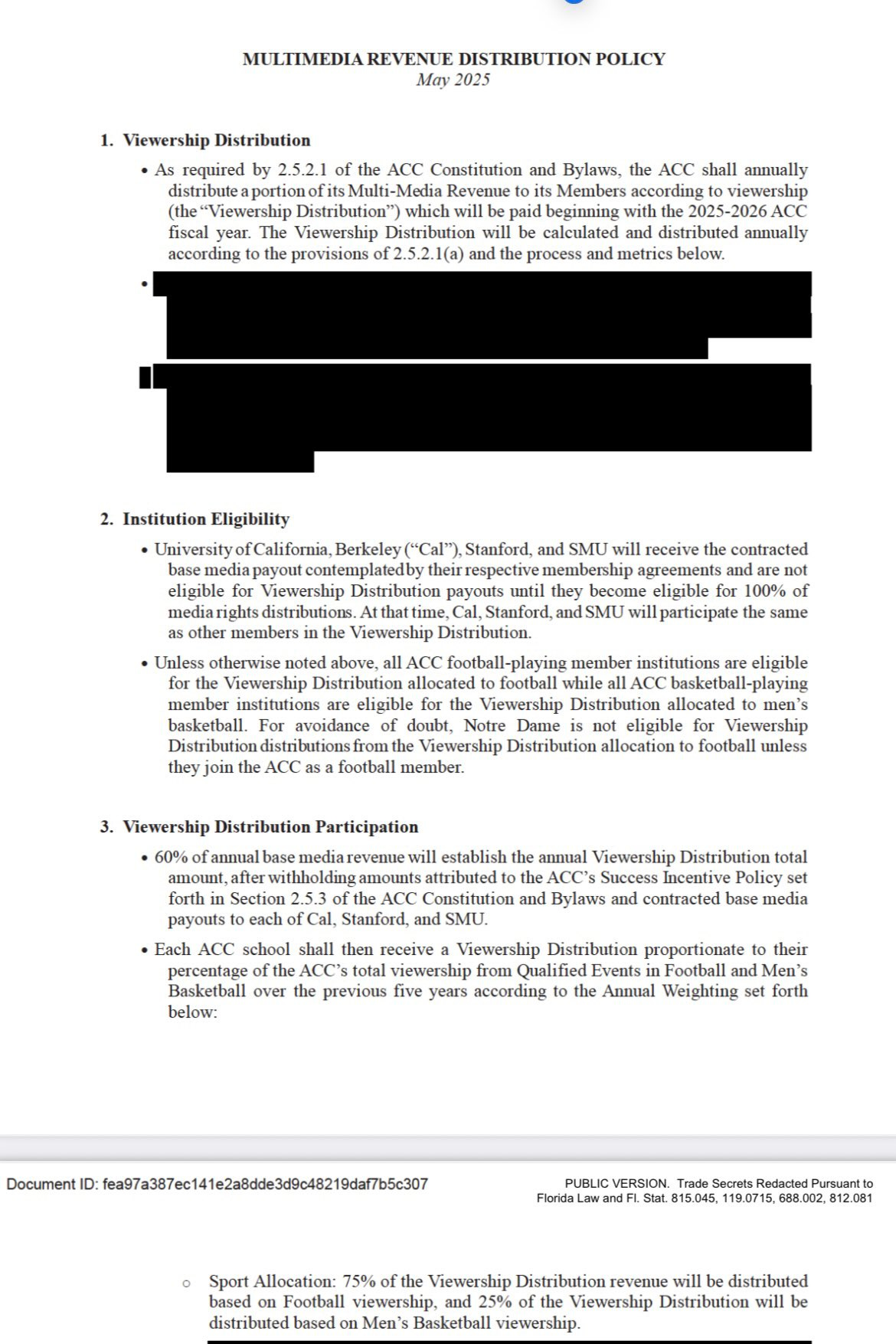 The notable change is with revenue from the league’s multimedia contracts. The first 40 percent of that money from sources will be split evenly among the schools. Of the remaining 60 percent, three-quarters will be distributed based on football TV viewership, and one-quarter will be based on men’s basketball viewership. Other details were redacted and claimed as trade secrets.