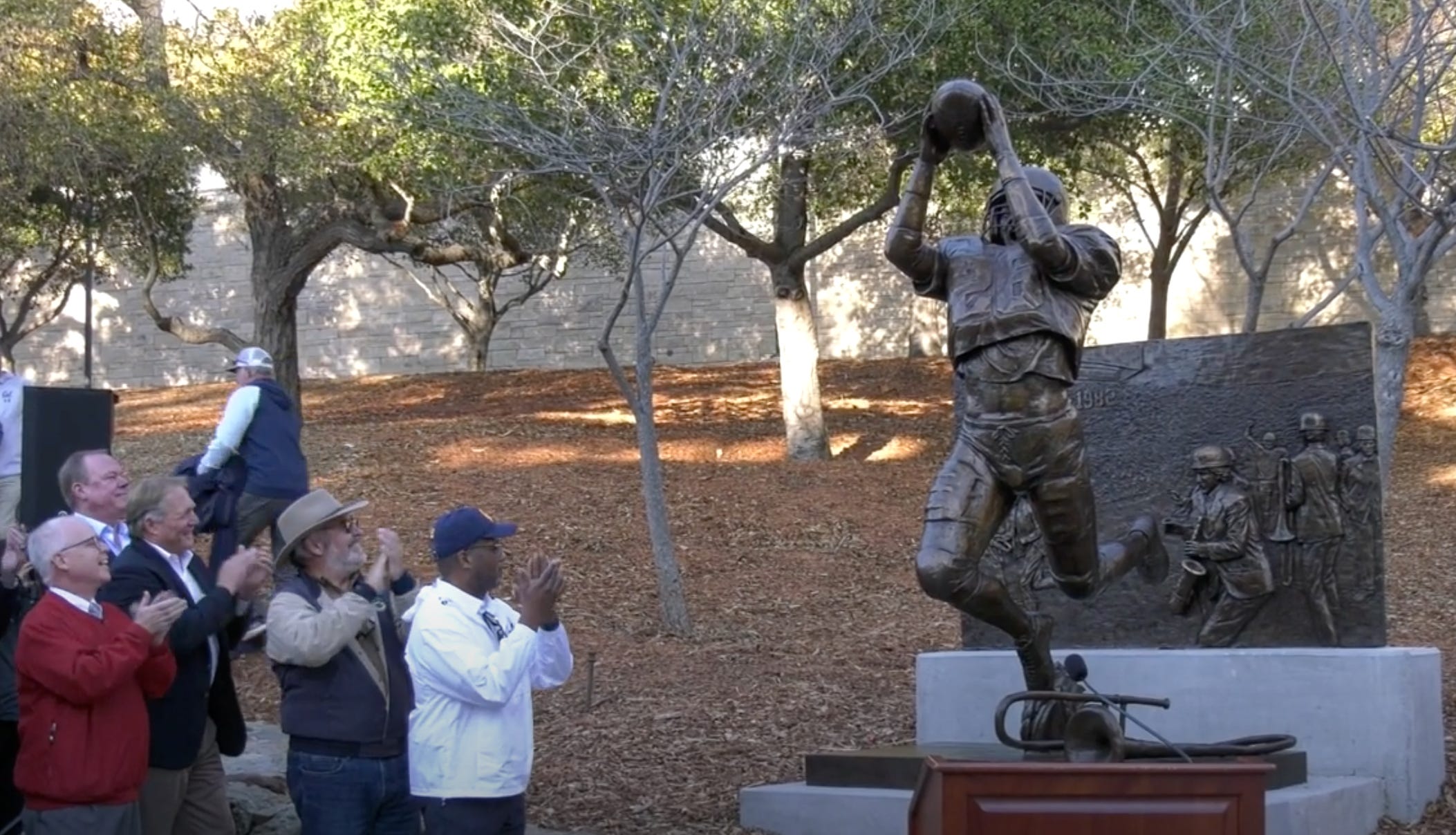Here’s the full press conference available below, hosted by Roxy Bernstein, featuring members of the Play, including Kevin Moen, teammate Ahmad Anderson (team member who created the “Bear Territory” chant), announcer Joe Starkey (who had the famous call of The Play is retiring after the season), and Stanford band member Gary Tyrrell, whose trombone lives at the bottom of this statue while his fallen body is spared.