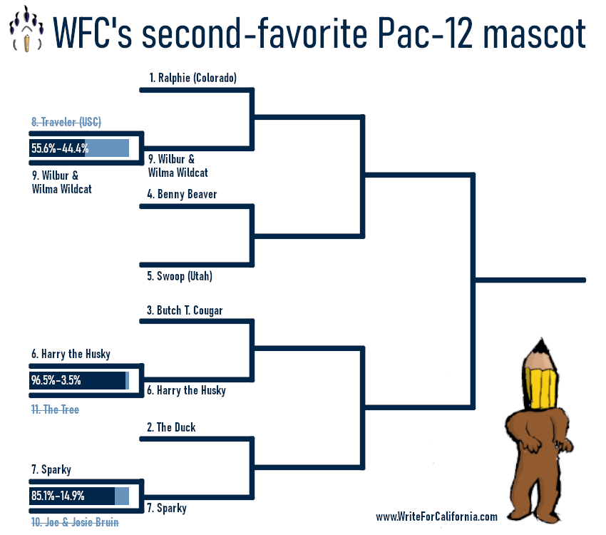 Speaking of unique, the Pac-12’s most unique mascot was decisively handled in the most-lopsided match-up with #6 Harry the Husky moving on. As surprising as it was to see 3.5% of you vote for the #11 Tree, it was all the more surprising to see which WFC writer betrayed us all by ranking the Tree anything but 11 during our seeding process.