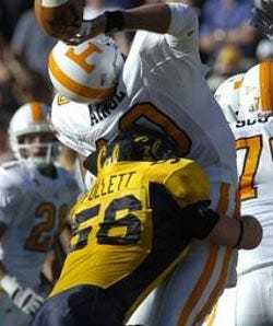 Arian Foster receives the kick and future Cal Stars in Jahvid Best and Mike Mohammad makes the tackle. It’s still crazy to me to think Jahvid’s first action as a collegiate player was tackling Arian Foster. A few plays later linebacker Zach Follett, practically snaps Erik Ainge in half, in one of the most symbolic Cal photogenic moments ever (See below). Not enough can be said about the sack-fumble. Follett came off the edge untouched with insane speed and just homed in on Ainge from across the line of scrimmage. Worrell Williams then picks up the fumble and takes it to the house for the first score of the game. Another cool moment was seeing current Kansas City Safety Eric Berry in as a freshman, ranked the #1 CB in the class of 2007.