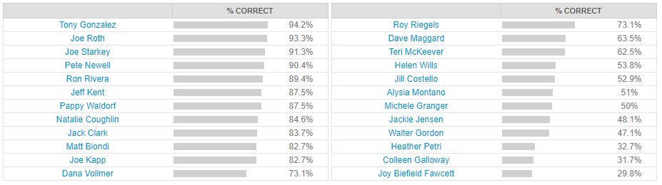 As it turns out, the answer is largely yes. Unsurprisingly, the football and basketball HOFers were highly recognized, but Cal’s incredible collection of Olympian swimmers got high marks as well. Sadly, spare a kind thought for Joy Fawcett, who deserves more renown (among Cal fans and among USWNT fans) for being such a National Team mainstay. 7th all time in caps! Two world cups!