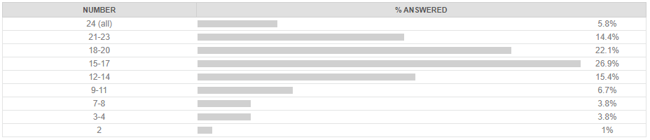 A perfect score was tough but not impossible, and there were quite a few folks who got the 20 or more required to get into the B-or-better range. I’m going to assume that those small handful of folks who got 4 or less got distracted in the middle of the quiz and time ran out.
