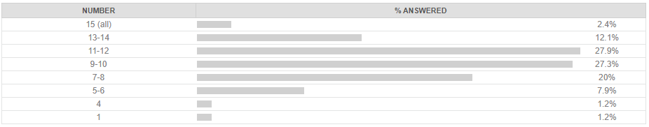 For whatever reason this quiz has been the most popular so far in terms of total plays, already edging out quizzes that have been published for weeks. Maybe it was easy to do multiple times? Maybe you just like reminiscing about wonderful Cal football wins* from the past? Regardless, most folks settled in the 10-11 questions right range, as this was another quiz that was easy to do OK in but hard to get perfect.