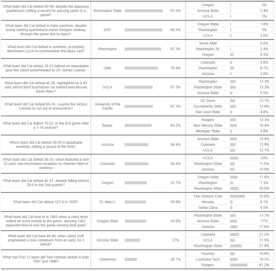 Multiple choice quizzes make for a big results page - I actually cut off the top answer, which was a criminally easy question about a memorable win over Stanford. Some of the results surprised me, most of all a question about Jared Goff’s final home game in 2015, though I suppose the question was phrased in a misleading way as those Cal teams fell behind and came back in half their wins.