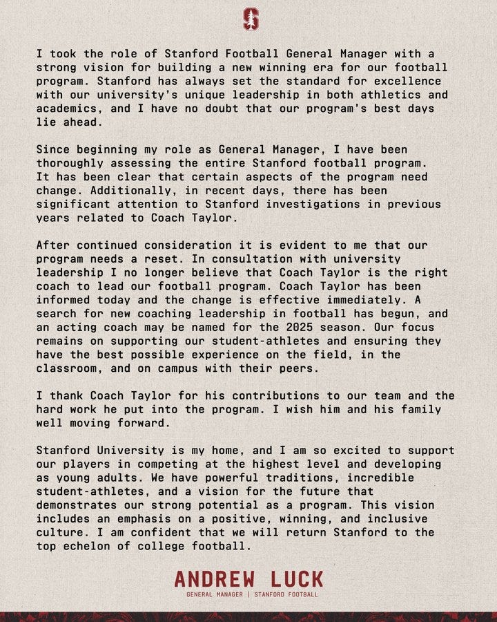 The California Golden Bears will be facing a new adversary for the 2025 Big Game. Troy Taylor is out at Stanford. The decision was made by new Stanford general manager Andrew Luck.