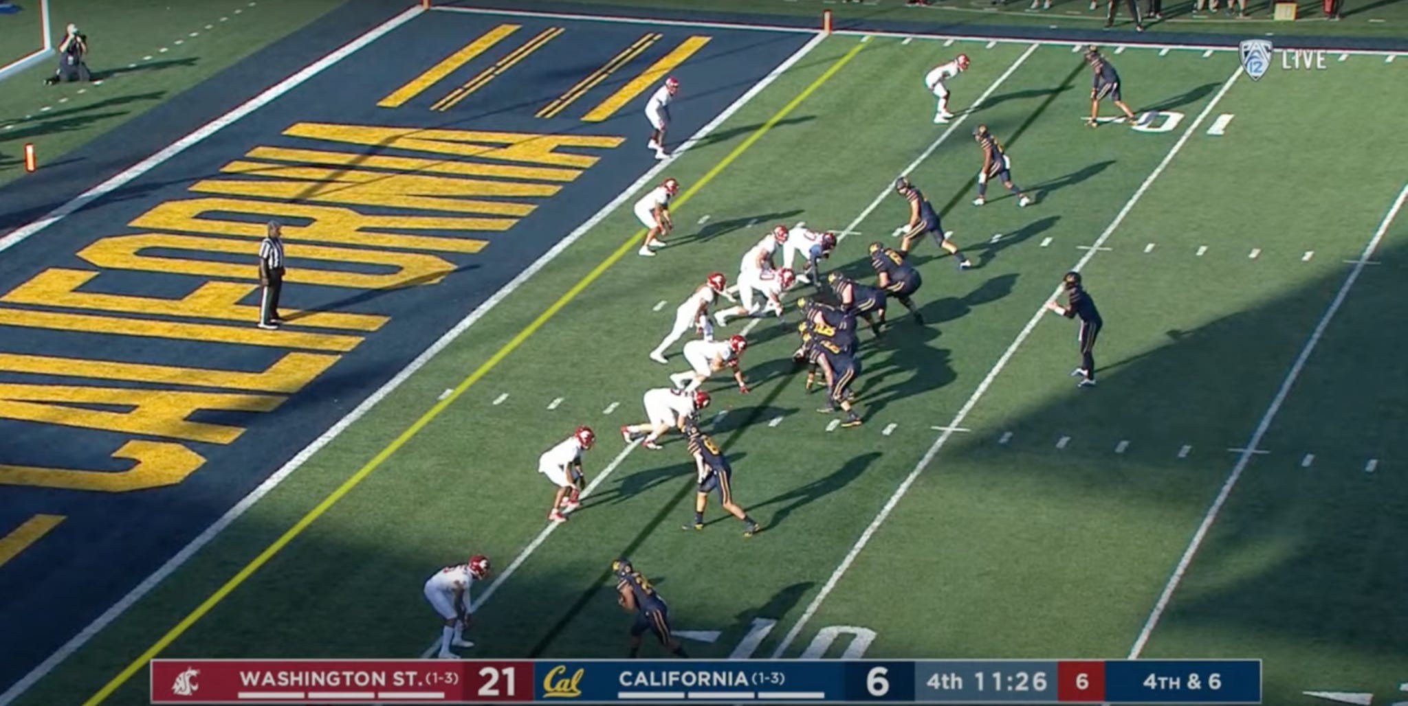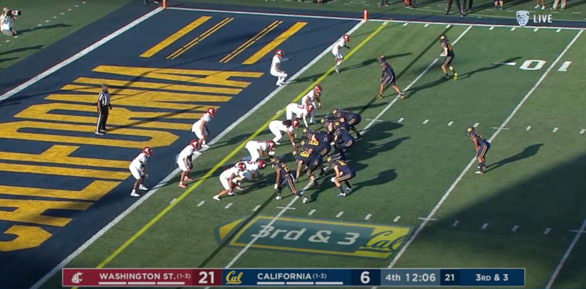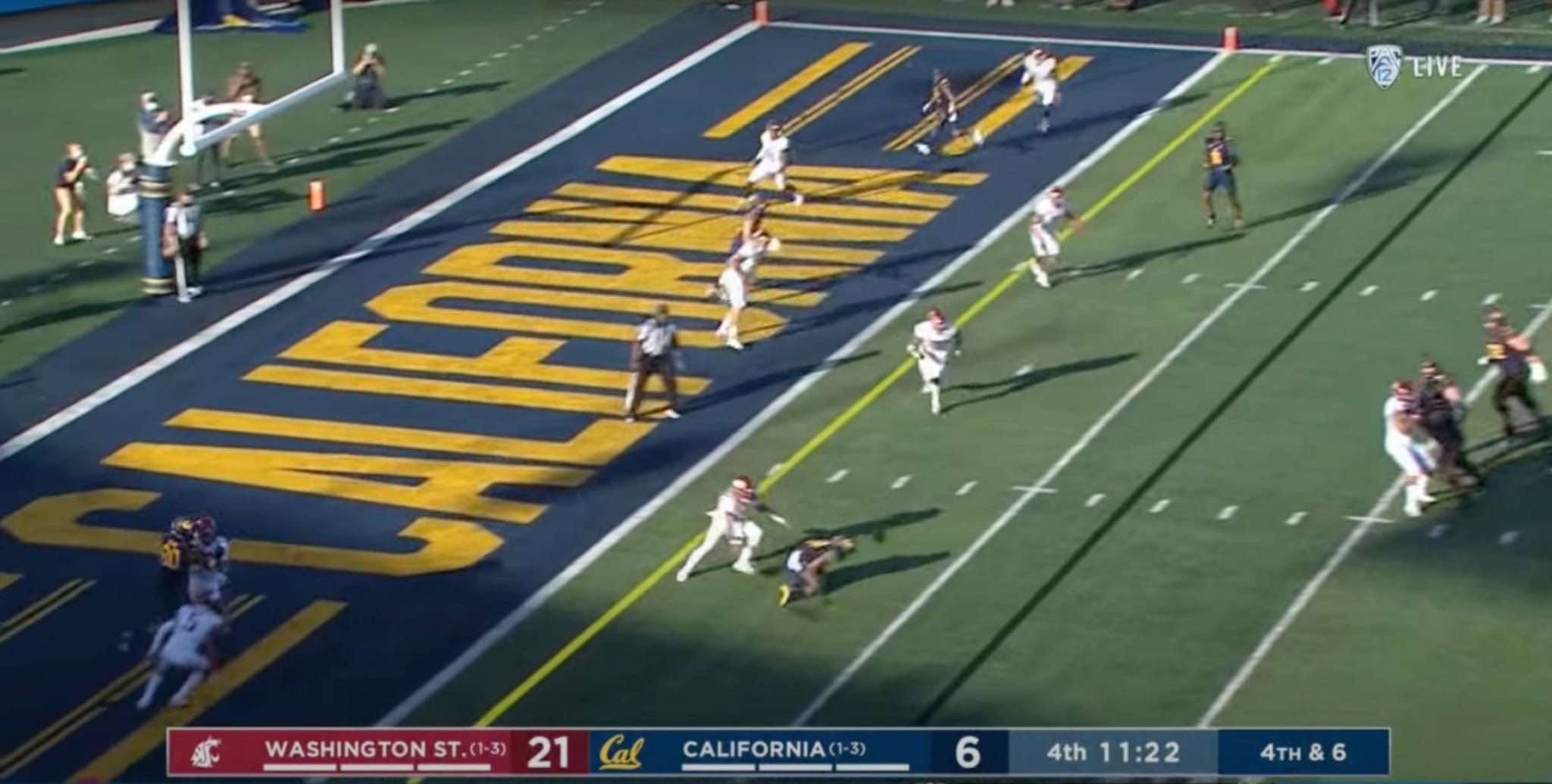 Trailing 21-6 and facing a third down from the Wazzu 39, Garbers found Trevon Clark for a toe-tap catch along the sideline, setting up Cal for a first down at the WSU 11. Make it or break it.