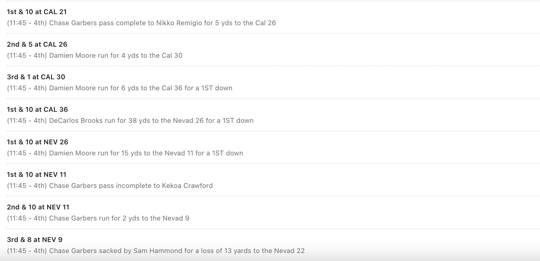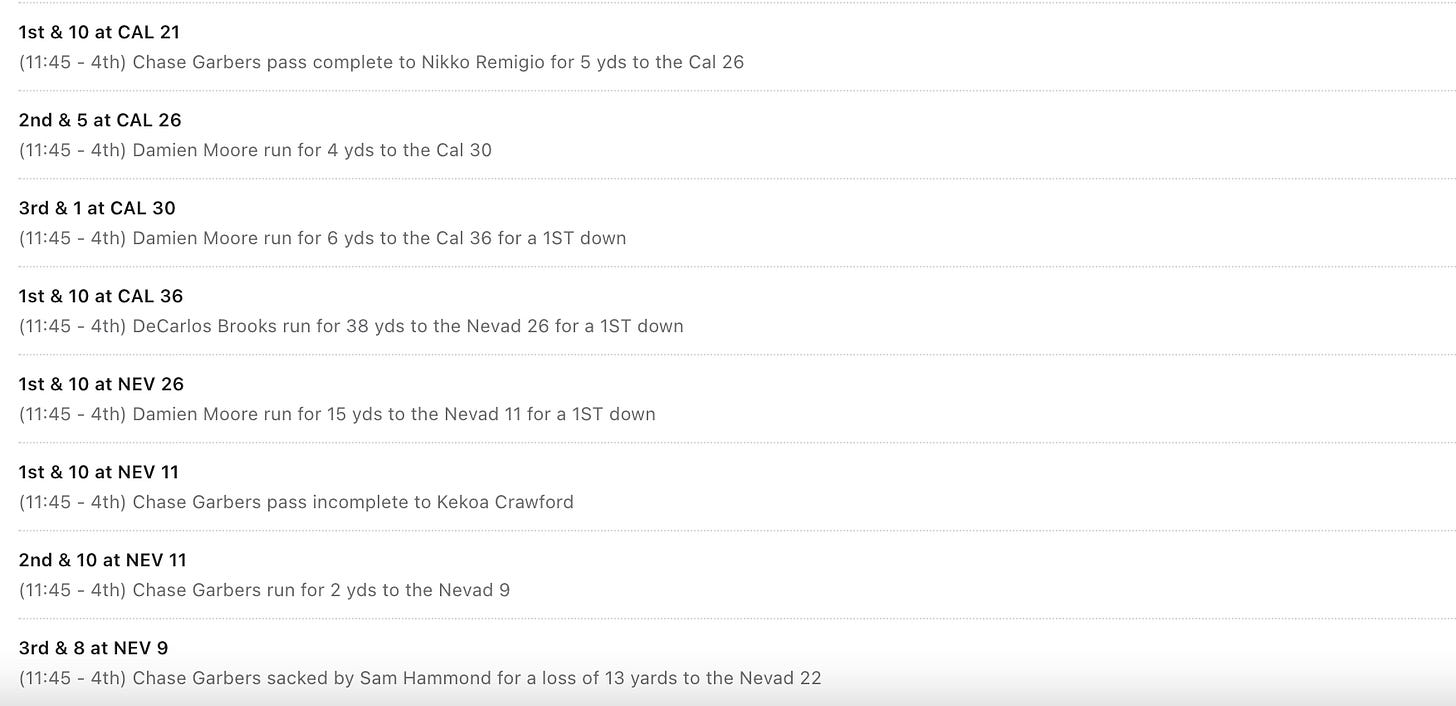 And then, with the strong side of the field suffocated in the endzone on third down, Garbers’ knee is ruled down as he attempts to fling the ball out of bounds — at the Nevada 22.