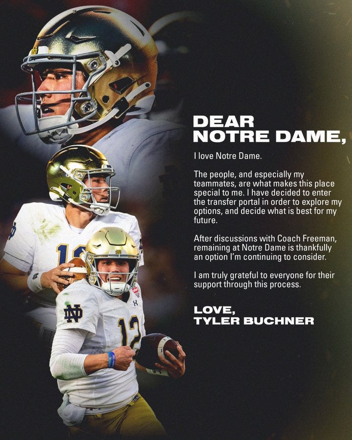 2022 Notre Dame opening day starting quarterback Tyler Buchner is looking for a new home, entering the transfer portal after a tough spring in South Bend. Buchner had some nice performances his junior year, including in the Taxslayer Bowl against South Carolina, but injuries cut short his season (he did not play in the Cal loss). He struggled with interceptions but does have a lot of talent and would be a clear additive to any quarterback battle.