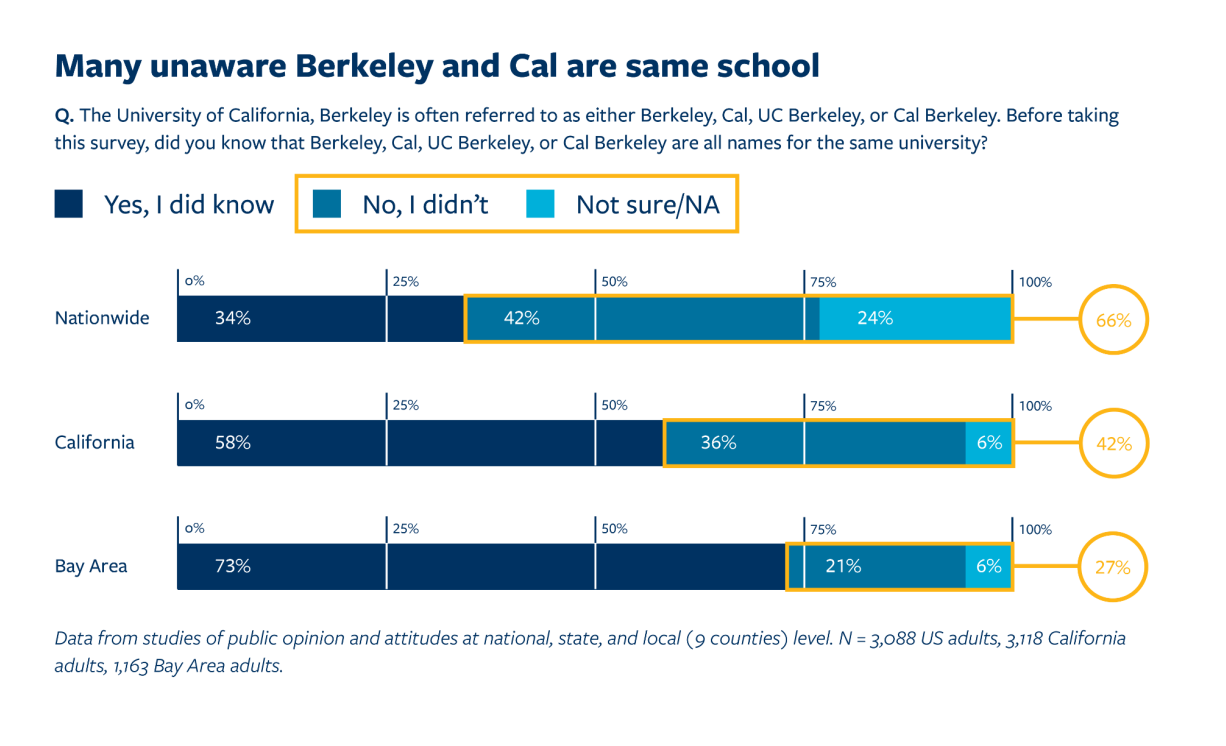 Cal is the known athletic brand for all UC Berkeley sporting activities. However it is not well-known nationally (66% polled nationally and 42% in the state of California did not realize Cal and UC Berkeley were one and the same) and has struggled with a lack of recognition compared to more well-known brands like Stanford, USC and UCLA.