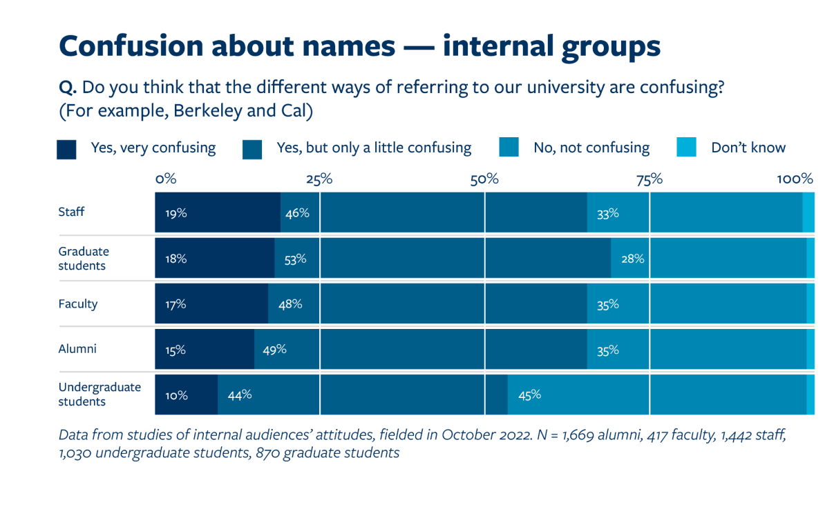 Evolve and elevate Berkeley as the principal campus brand. Lead with Berkeley in academic, administrative, auxiliary, community, development and student life contexts, especially in naming campus units. Update the logo to reflect this change and look for ways to establish a visual connection to the athletics identity.
