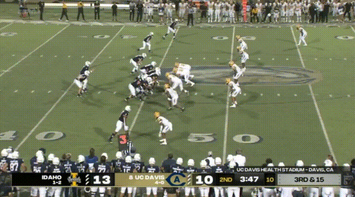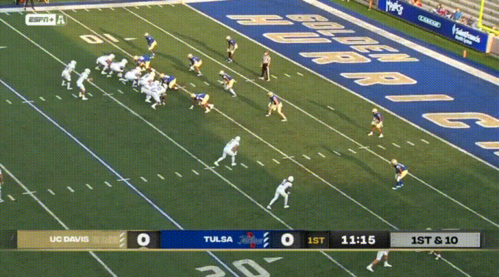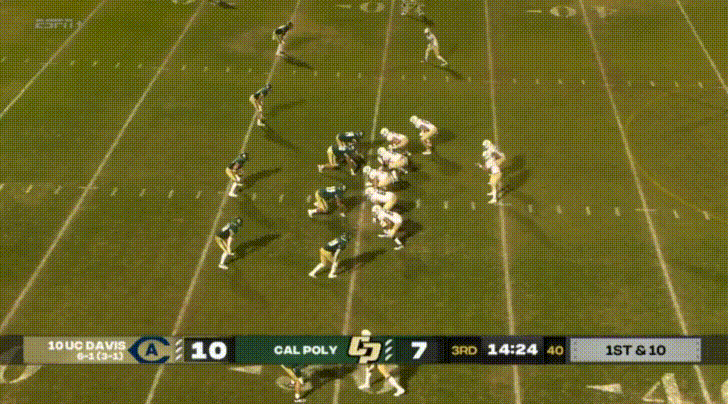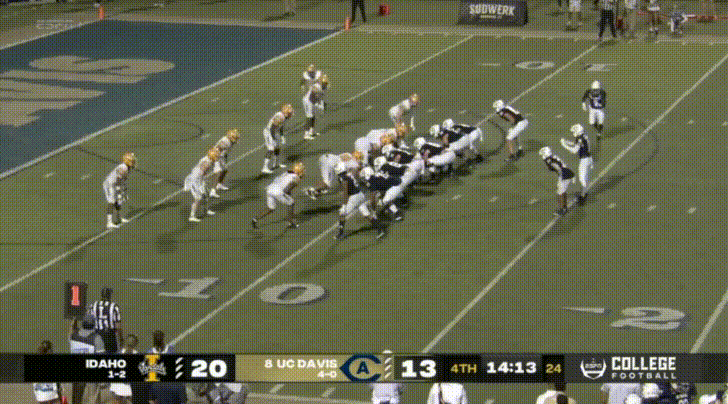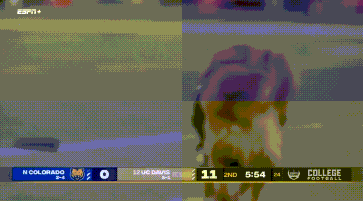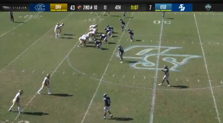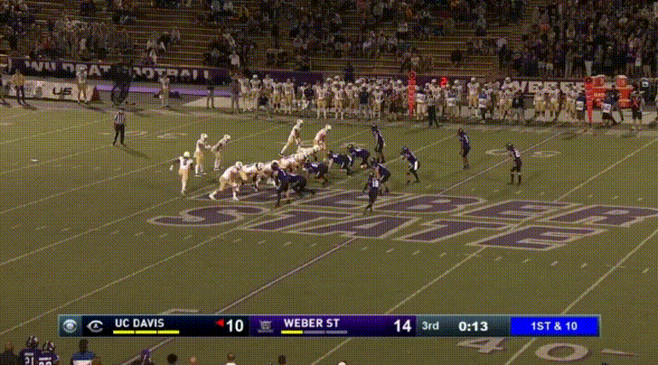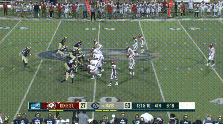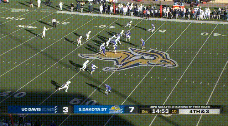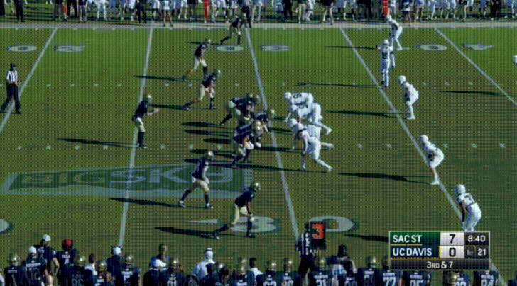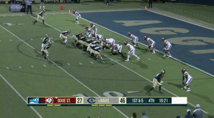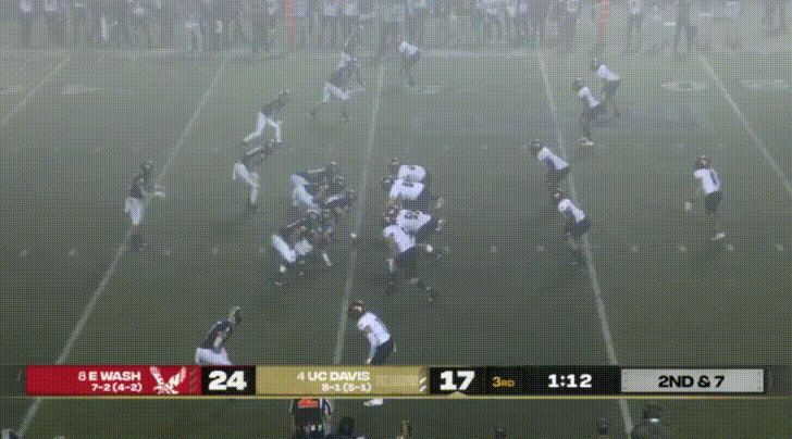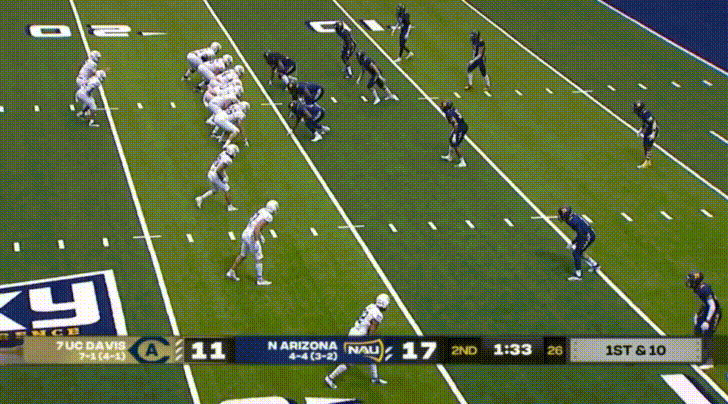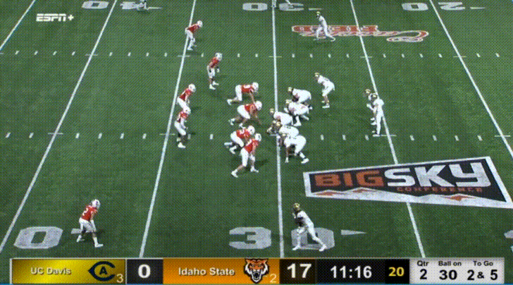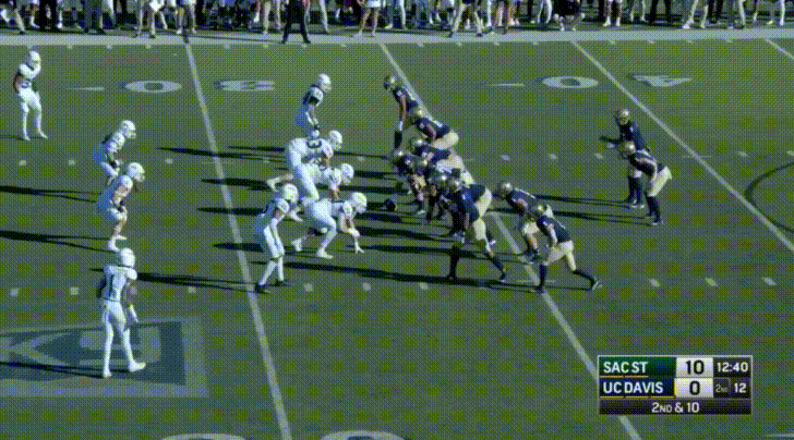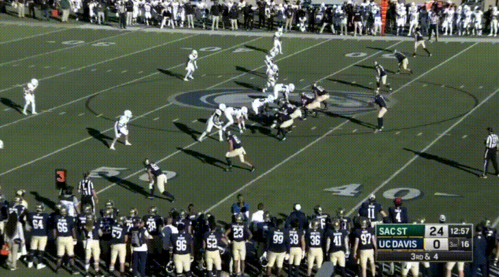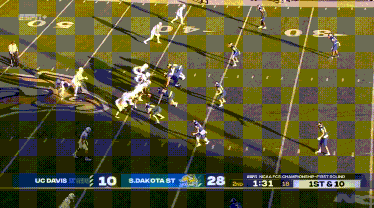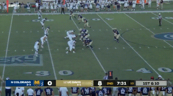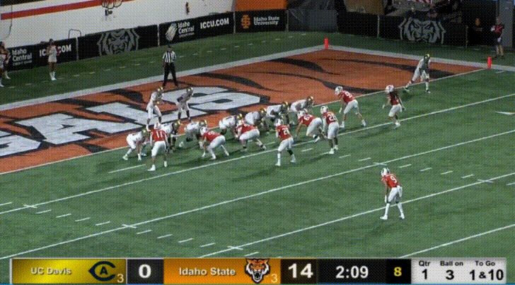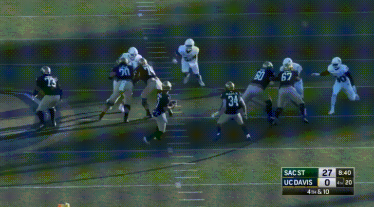 UC Davis will let Tompkins quarterback entire drives, so it’s less obvious than “the running QB is in, get ready for a run.” He’ll probably run the ball, but UC Davis will try a lot of misdirection using his versatility: maybe he’ll throw a screen pass to a running back lined up out wide, maybe it’s a legitimate pass play, or maybe Tompkins is used as a decoy. Regardless, Tompkins is able to get a first down all by himself if need be. Expect a lot of trickiness with Tompkins at the wheel.
