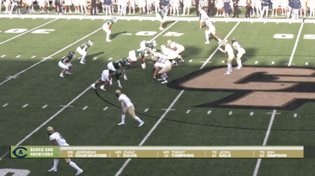 The tight end opposite Josh Gale is Ian Simpson, who was primarily used for blocking, but he also showed a knack for running through tacklers when he did get the ball: