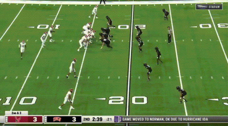 I think their most obvious playmaker on the defense is the TCU transfer, defensive end Adam Plant Jr. He was a 4-star defensive end out of Bishop Gorman. Here he uses a speed rush to the outside to beat the left tackle and absolutely demolish the Idaho State quarterback: