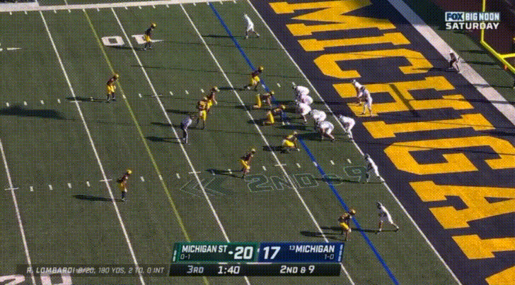 Here it looks like the left tackle Daviyon McDaniel—a name I noticed a lot—simply doesn’t see the edge rusher on a 3 man rush: