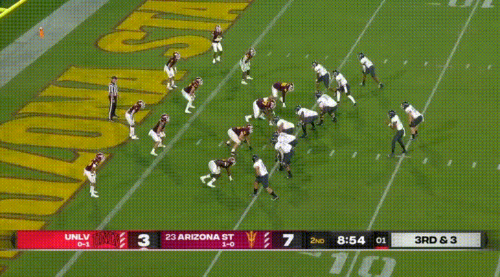 UNLV had less-than-mobile QB Justin Rogers (he of the famed Cheez-It Bowl), and so this sack is a little bit on him, but his offensive tackles are beat on both sides of him: