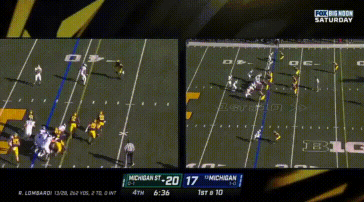 With the game on the line, the offensive line came up short in the following play. It’s a 5-man rush against 5 in protection, so it’s on the quarterback to shift his protection (or at least be aware of the unblocked rusher) here, but he was likely more preoccupied with the clock in this situation: