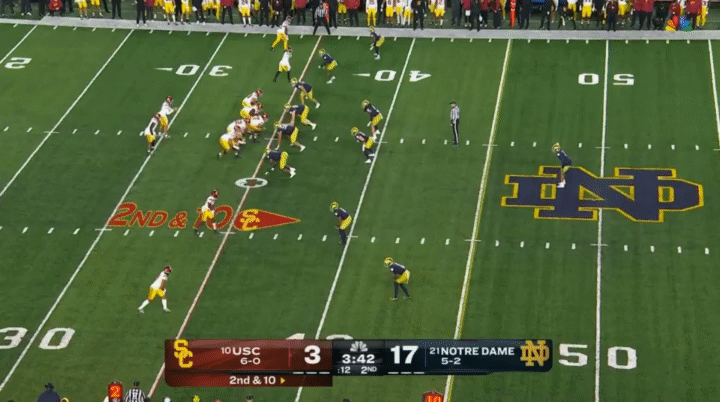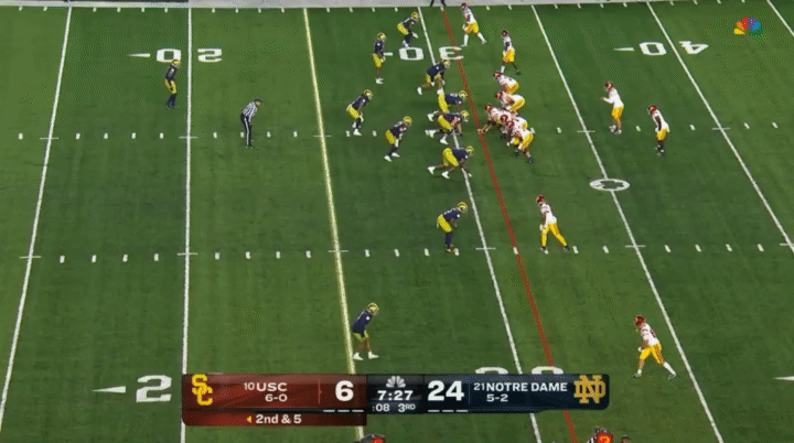 USC has a great offensive line, but they can’t be expected to hold up forever. No matter, Williams is super elusive in the pocket and is very tough to bring down. Notre Dame’s defense took advantage of these tendencies and gave Caleb the worst game of his college career (23/37 199 yards, 1 TD/3 INT). They were able to do so because Notre Dame has an excellent defensive line (Cal fans may remember 2022), preventing Williams from sitting in the pocket all day, and made Williams force a number of bad throws, desperate to make something happen: