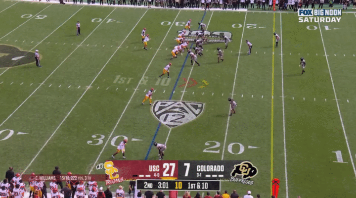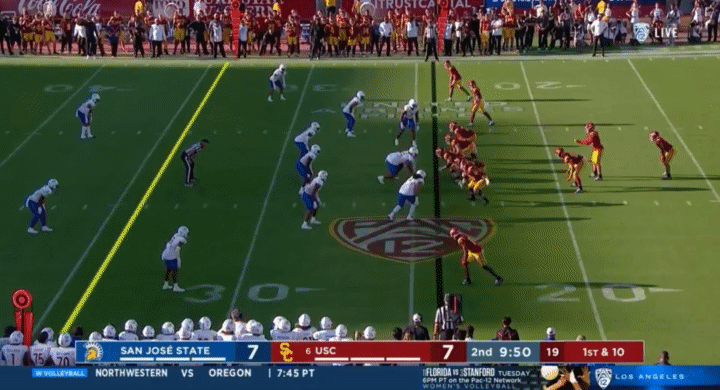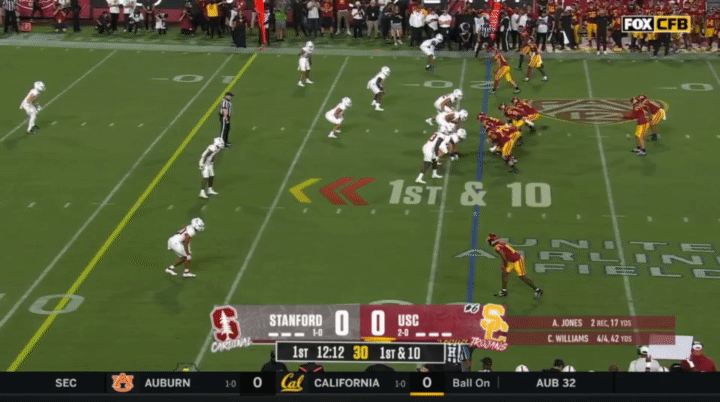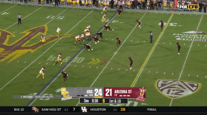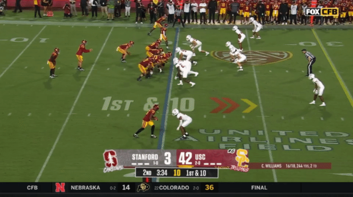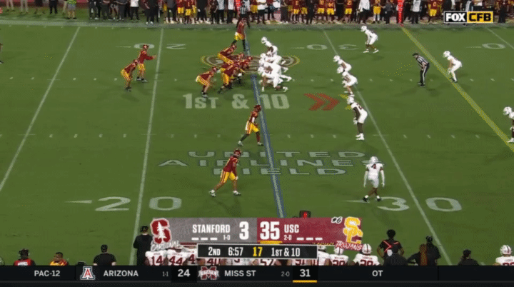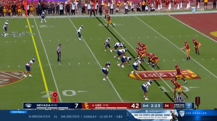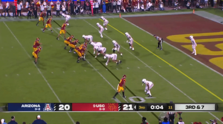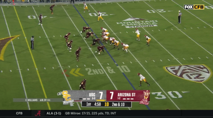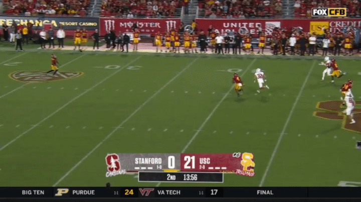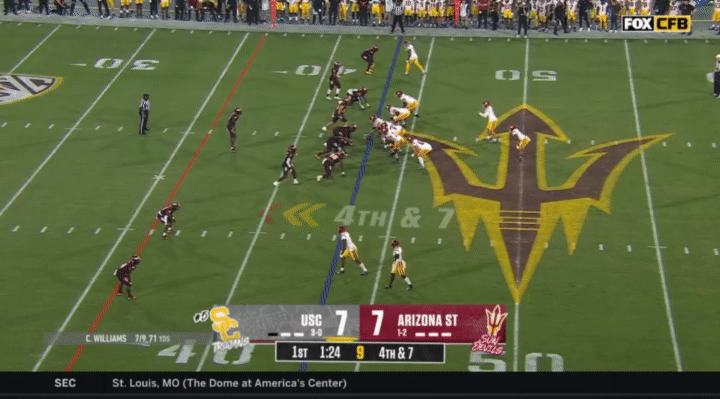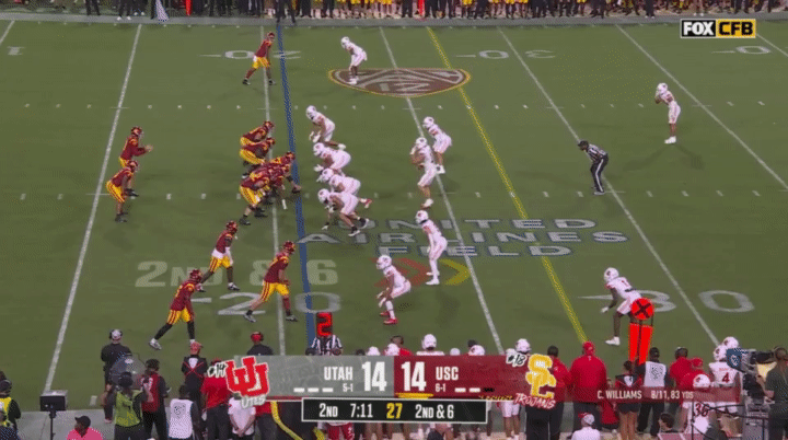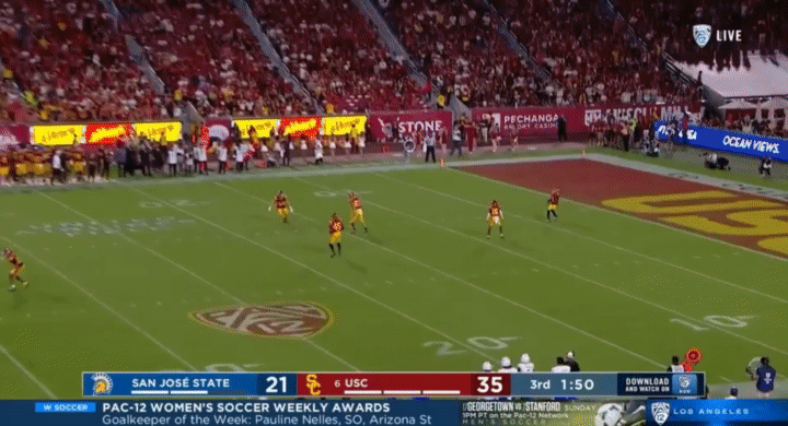 The USC offense has not been nearly as creative at scheming receivers open this year (perhaps Lincoln Riley is too busy polishing his resume for NFL teams), and what will often happen is that Williams will sit in the pocket forever, and wait for someone to get open on the scramble drill:
