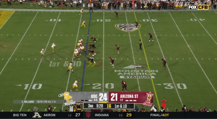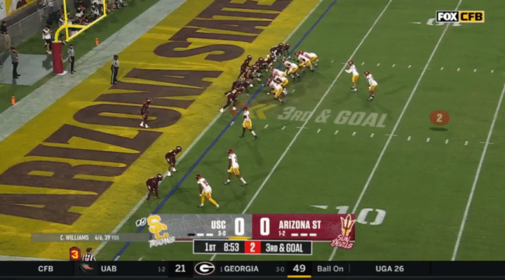 The following play actually looks like a good job on defense by ASU (they had defenders ready for both the QB and RB), but Williams athleticism is just too much, and he somehow turns it into a positive play and a touchdown anyway: