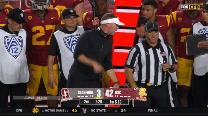 USC is basically known for never getting any favoritism for the refs, so it’s important to tear into them when a call doesn’t go your way (in the above case, it was disconcerting signals to cause a false start by the opponent, a 5 yard penalty). Surely refs enjoy this and will definitely not let their personal grudge against you get in the way of their jobs.