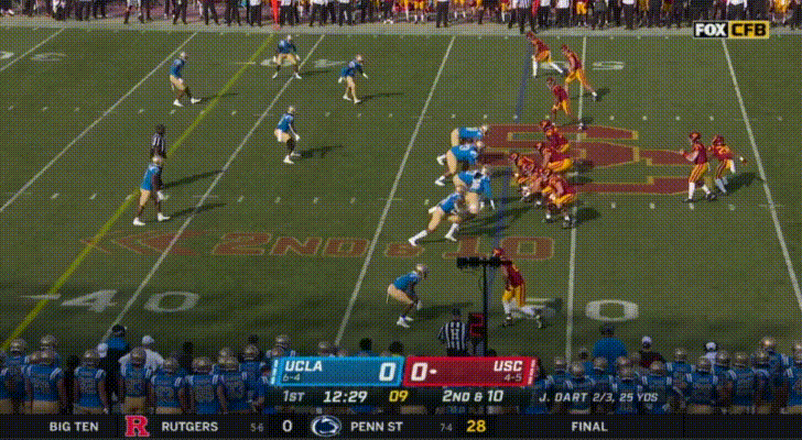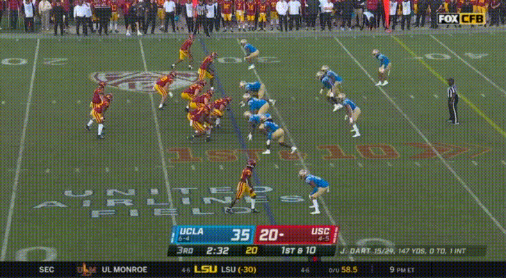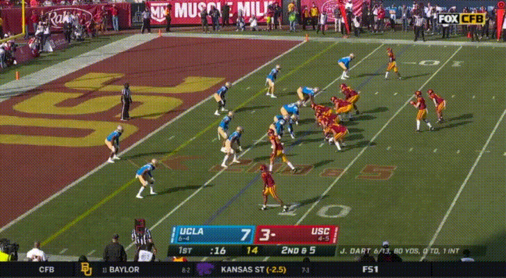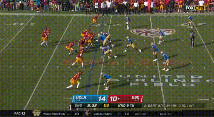 While Slovis almost certainly would have thrown to a receiver locked in one-on-one man coverage or sitting wide open in the middle of zone coverage, it seems Dart is still learning the offense. He has the freshman tendency of locking onto a receiver or making his decision pre-snap (often not seeing a wide open receiver), and here it costs him an interception as he throws into heavy traffic:
