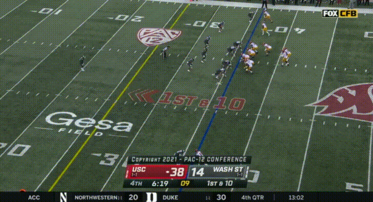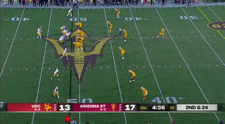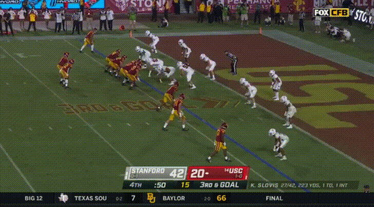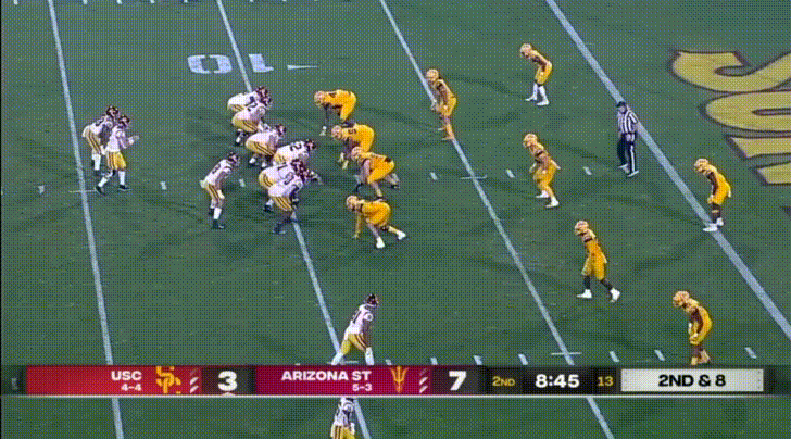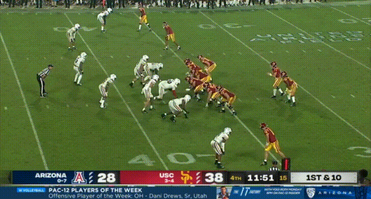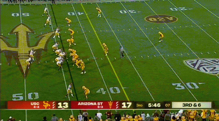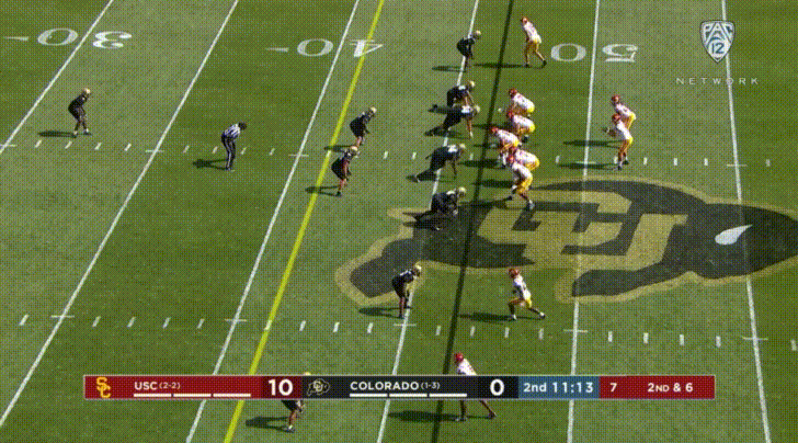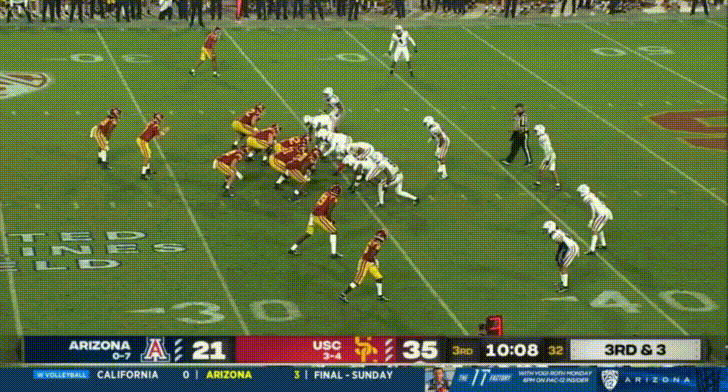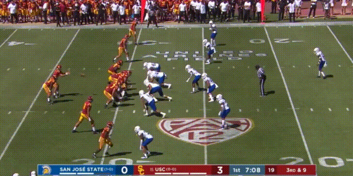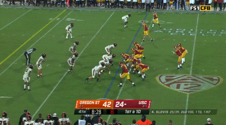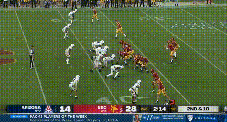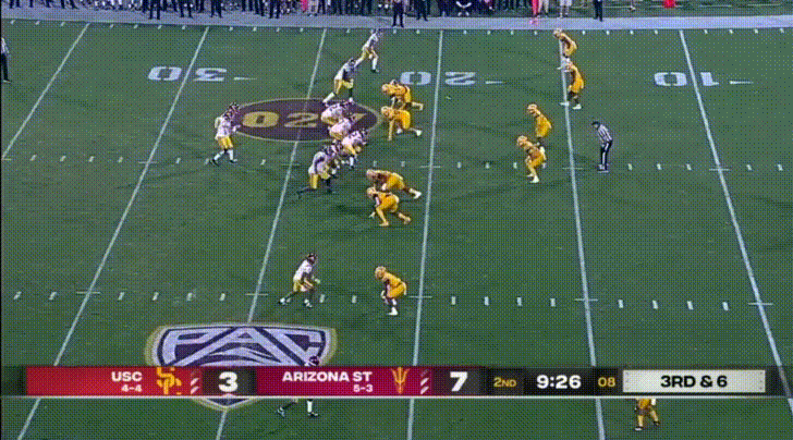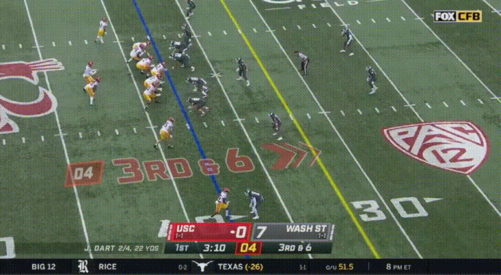 Of course, having phenomenal arm talent makes for a nice highlight reel, it doesn’t tell the full story. Talented quarterbacks or not, USC is 3rd in the Pac-12 in interceptions. While the ability to make a ridiculous throw can bail you out via “good defense meets better offense,” even the best quarterbacks can’t be expected to make perfect throws all game long. You have to be able to find the easy stuff in order to consistently maintain drives, and to do that, you have to understand what the defense is throwing at you. It’s something I expect Dart will improve with experience, but he’s still not there yet: