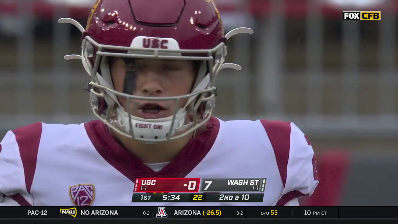 (QB Kedon Slovis decides pre-snap to throw it to WR Drake London on 3rd and 5 but misses London and doesn't see wide open TE Jude Wolfe)