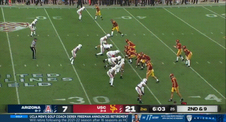 (QB Kedon Slovis does a nice job of avoiding pressure and finding an open TE Malcolm Epps for the first down)