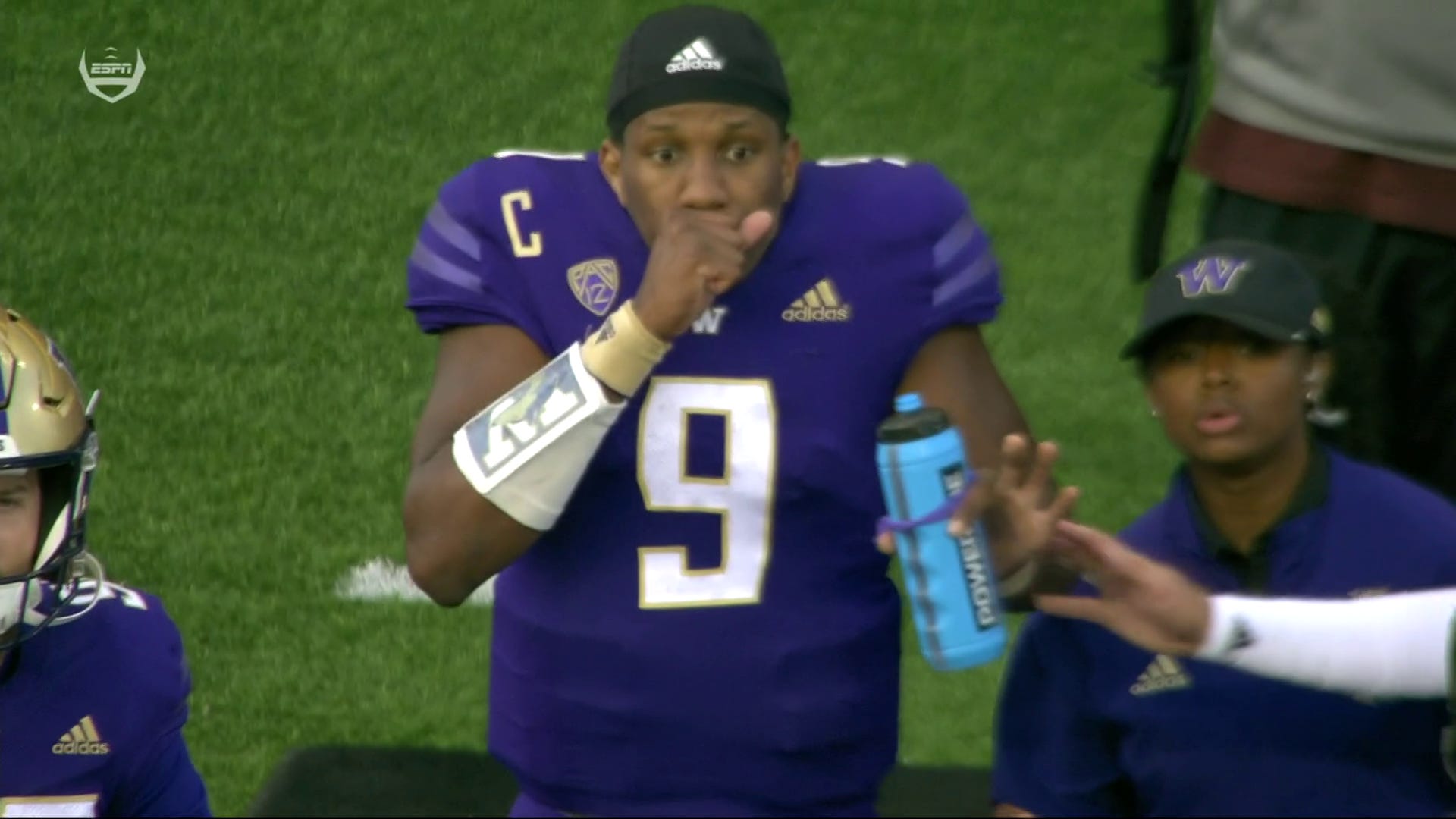Although Penix does not want to be taking hits—and his offensive line has done very well protecting him, allowing just 5 sacks in 7 games, good for top 10 in the FBS—he’s still able to make nice throws even when he can’t get his entire body into the throw, showing some toughness here: