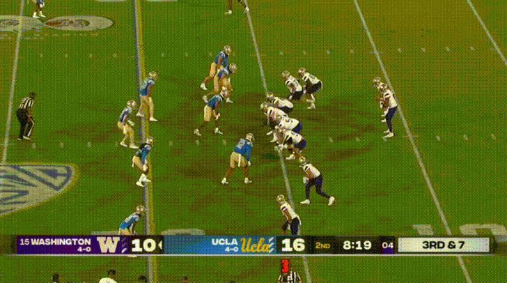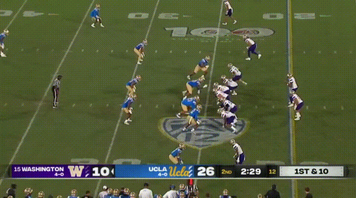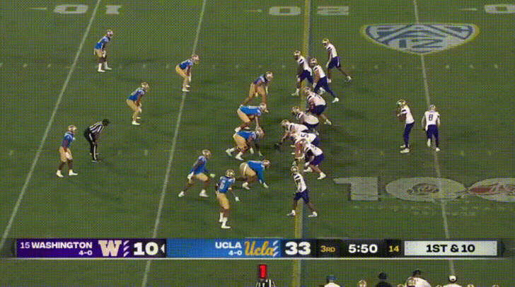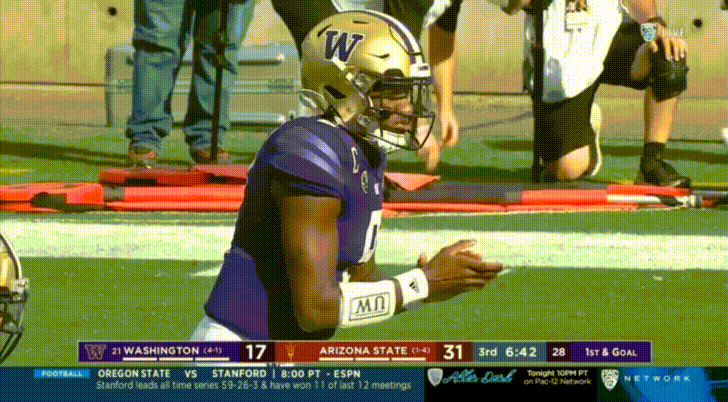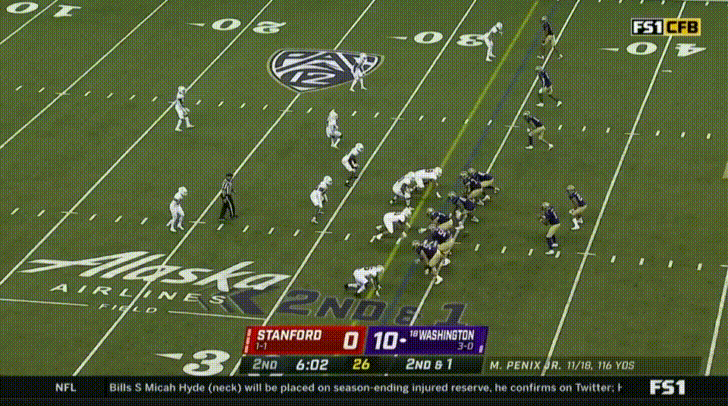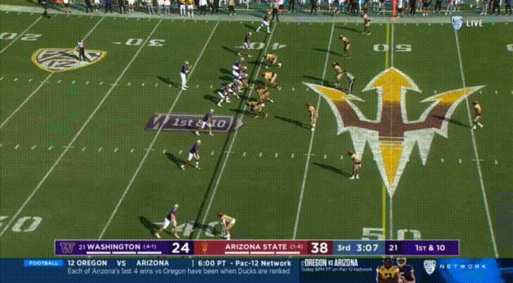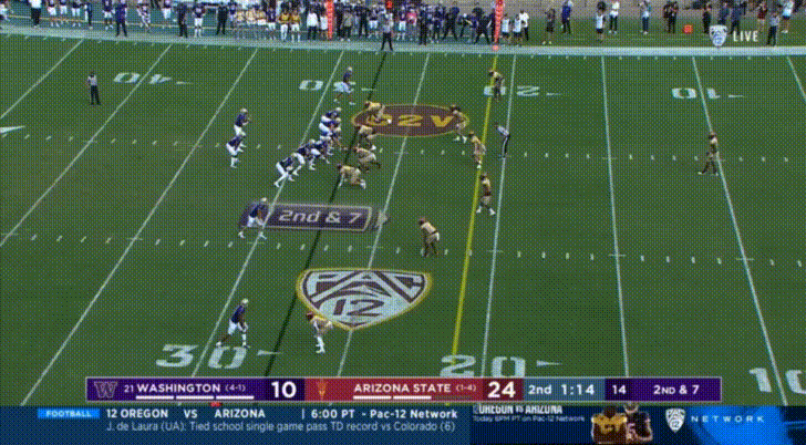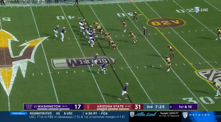 Despite having some talented players, the UW run game has been underwhelming this year. As I briefly mentioned earlier, it feels to me like UW is mainly just using the run game to set up the pass— run the ball, run the ball, then play action, etc. Even though I’ve been pretty high on some of these very same running backs in the past (Cameron Davis, Richard Newton), I only found myself taking one highlight clip of a running back through 7 games (the Cameron Davis clip below). UW has been relying on a committee of running backs, and has really spread the ball around this year: Wayne Taulapapa, Cameron Davis, Richard Newton, Will Nixon, Sam Adams, and even Jackson Sirmon’s younger cousin Camden Sirmon has gotten a few touches.