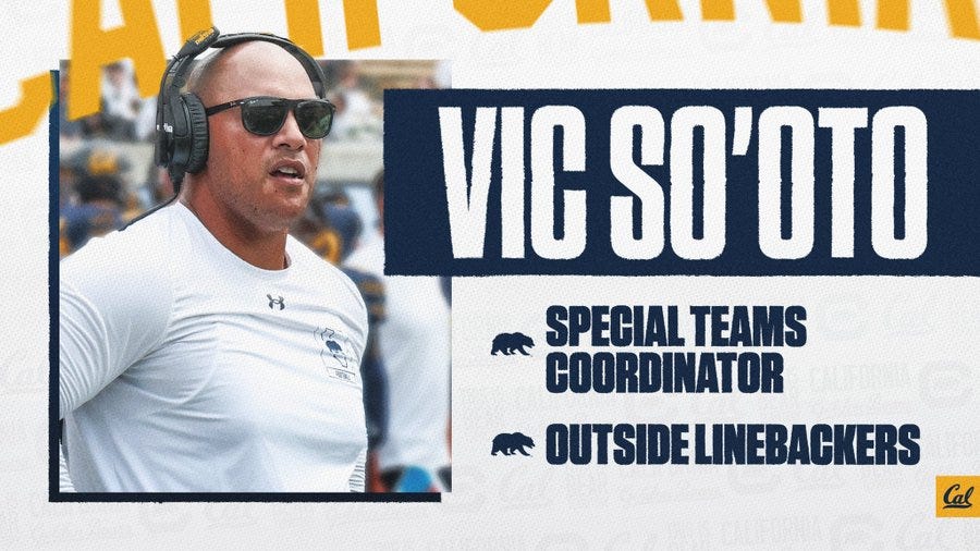 The California Golden Bears appear to have finalized their coaching staff duties for the 2023 season. Vic So’oto will be taking on special teams coordinator responsibilities along with his current outside linebacker coaching duties. This will be the first time So’oto has been a special teams coach—he has been primarily a position coach (defensive line at Virginia/USC, OLBs at USC/Cal).