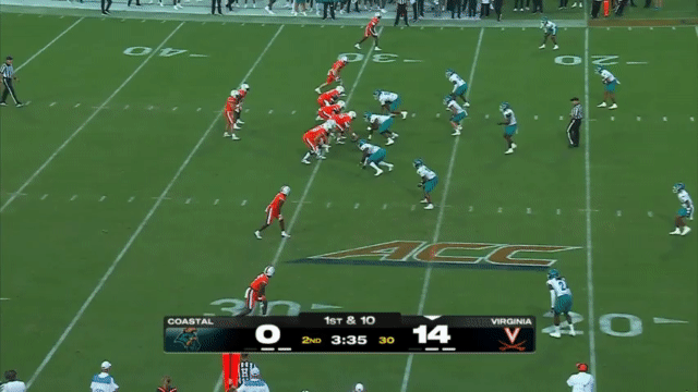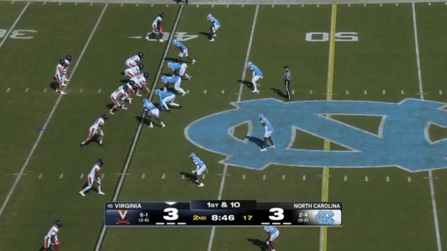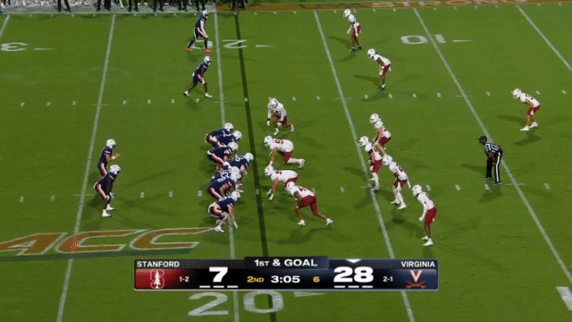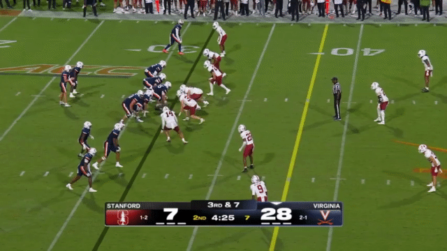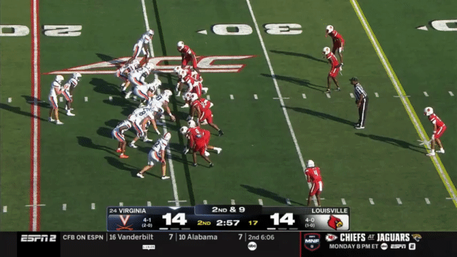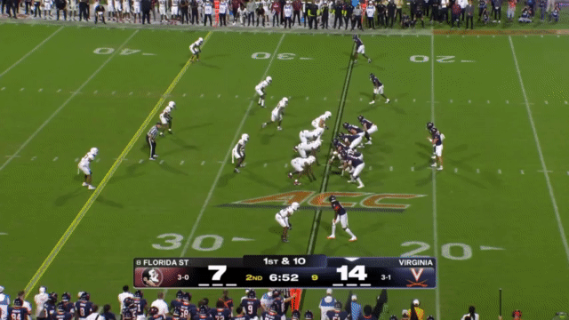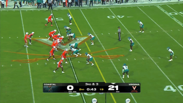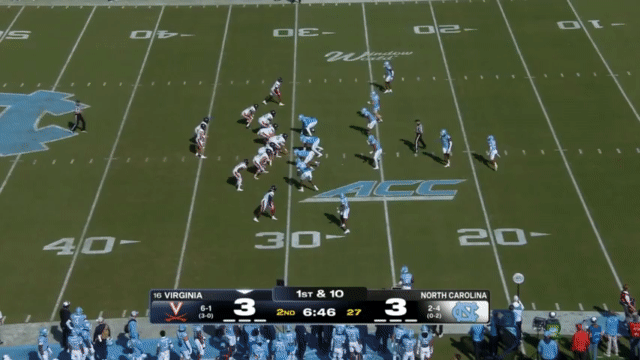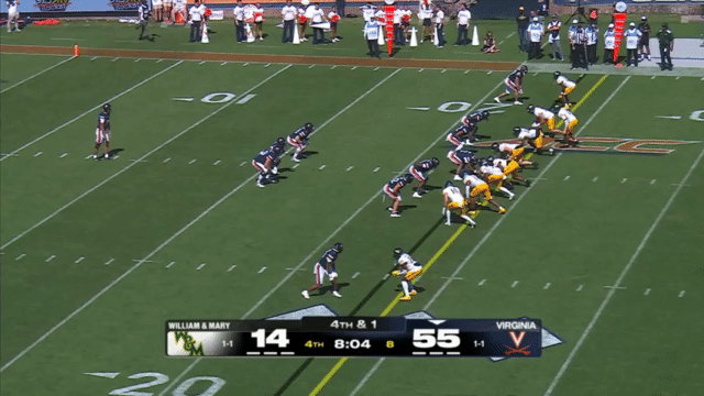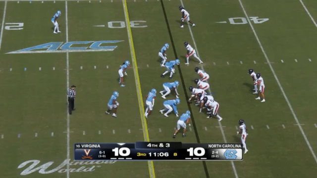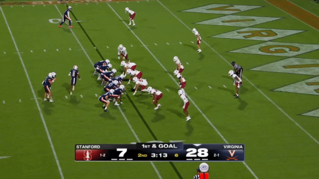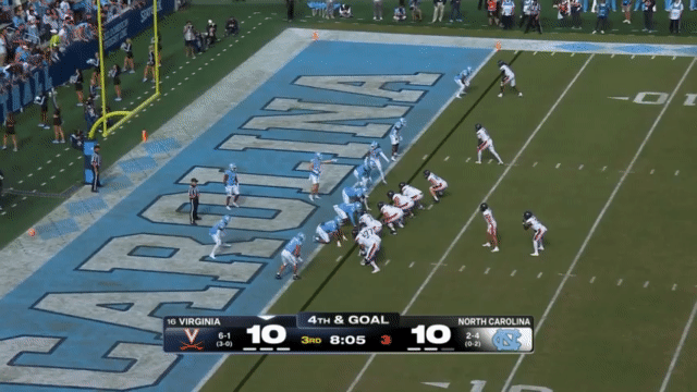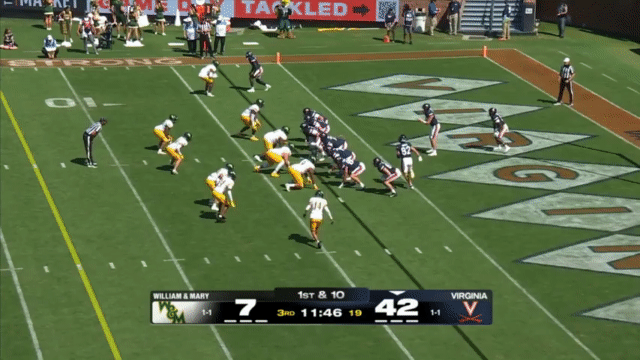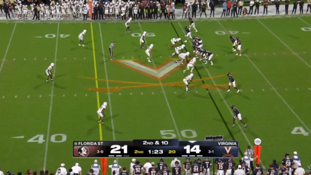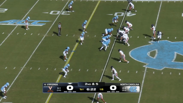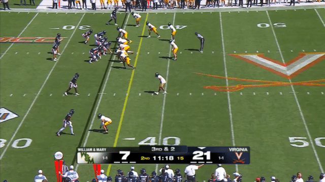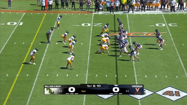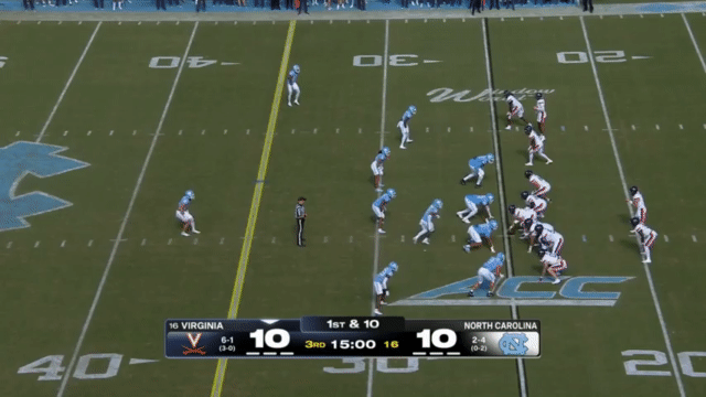 Waylee will also be used in wildcat formations. Virginia likes to use deception on this sort of snap, with the QB lining up and clapping for the snap, but then snapping directly to the RB instead: