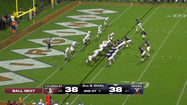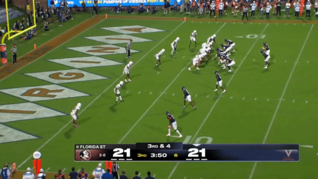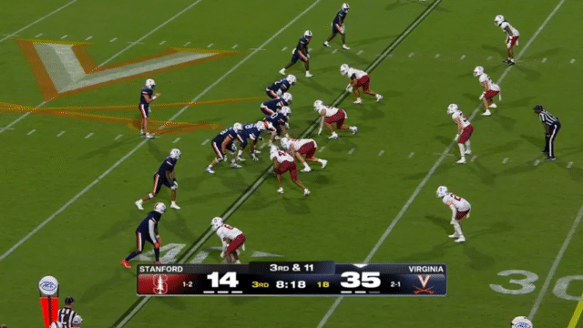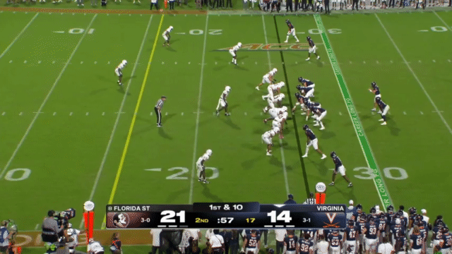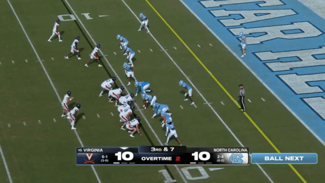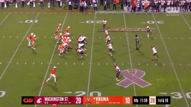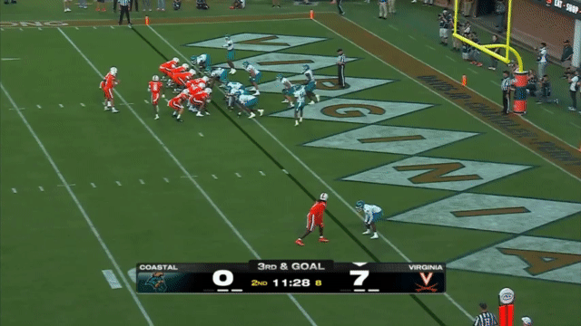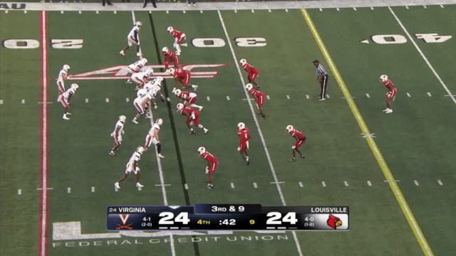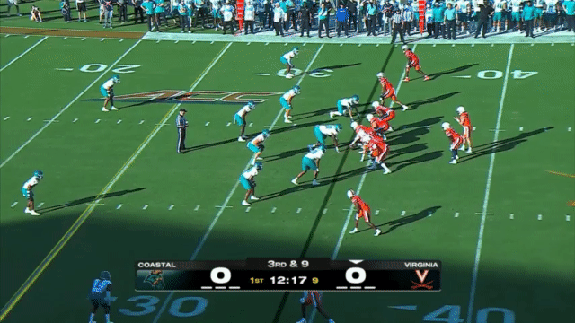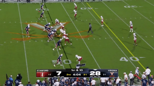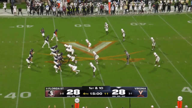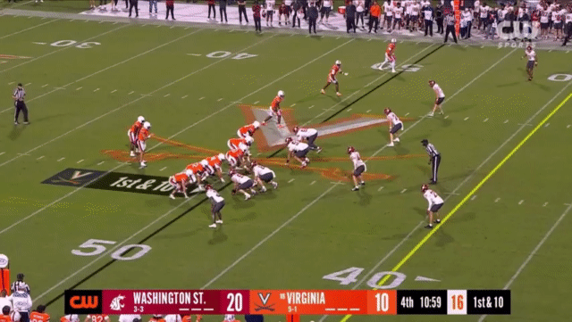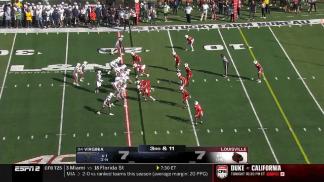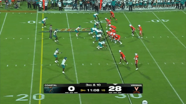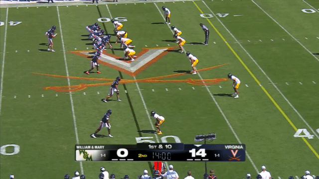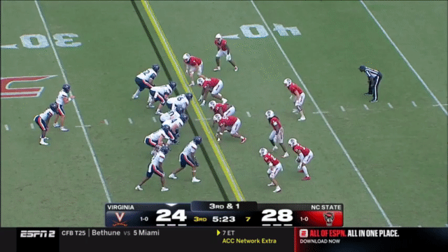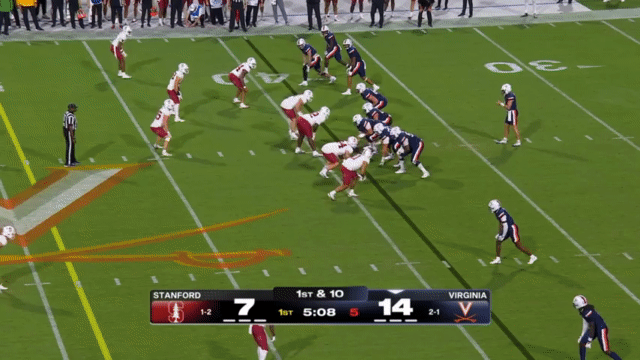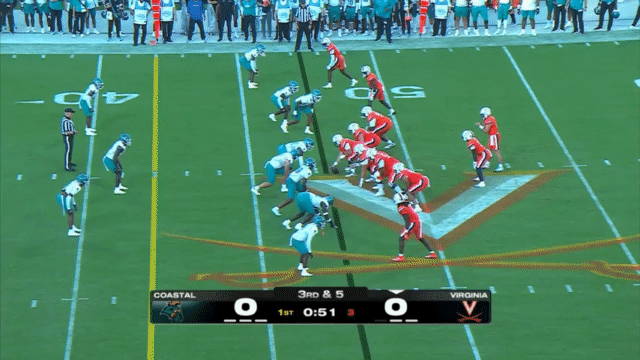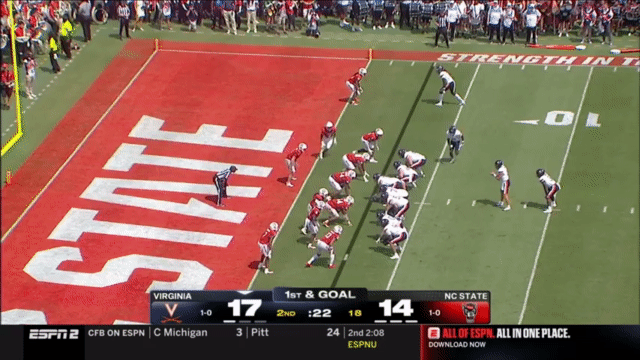 Waylee will also be used in wildcat formations. Virginia likes to use deception on this sort of snap, with the QB lining up and clapping for the snap, but then snapping directly to the RB instead: