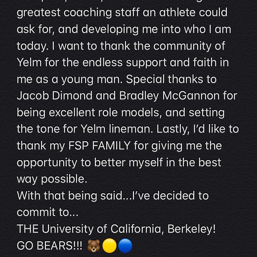 While one might fantasize about getting five star linemen, the brutal truth is that a lot of recruits cannot be targets because they don’t have the academic chops to make it at Cal. Dylan is juuuuuust short of a 4.0 GPA shows that he has the brains to belong at Berkeley. That alone is a huge achievement and a welcome qualification. We want football players who succeed in life, not just for the few years they play at Cal.