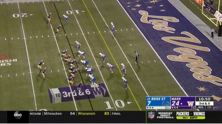 Officially, senior Kamari Pleasant was listed as UW’s starting running back, although he has been buried on the depth chart in previous years behind talented running backs such as Myles Gaskin, Salvon Ahmed, and the two younger backs above. Pleasant’s best career game was actually against Cal in 2018 (the beautiful disaster of defenses trumping offenses in Cal’s 12-10 upset— Weaver Pick-6, anyone?), when he ran for 62 yards on 12 carries. He’s actually the biggest running back of the three, but listing him as the starter seems a bit like misdirection, as it’s doubtful he’s taken such huge strides to earn the starting job after three years as the #3 or #4 RB.