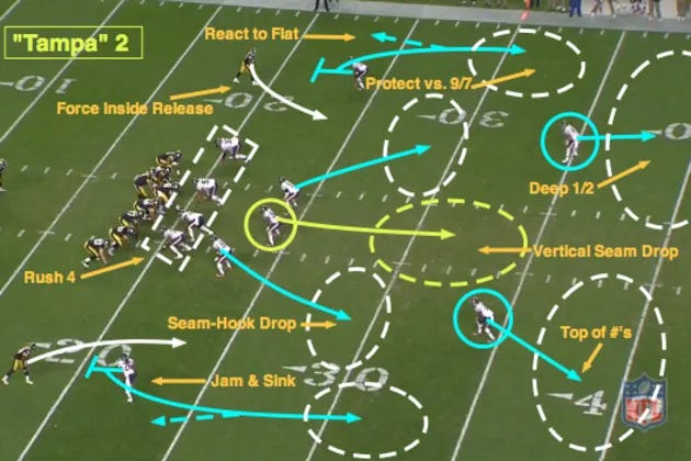 Below the Tampa-2 shows the MLB dropping deeper than in a Cover-2 scheme to take away the vertical seam with the ability to deepen the drop to cover the middle of the field. Fun fact: it is called the Tampa-2 due to Tampa Bay’s use of this scheme despite its roots with the 1970s’ Steel Curtain. Brian Urlacher won many accolades being the MLB in this scheme with the Chicago Bears under Lovie Smith. This scheme is a “bend-don’t-break” type and is familiar to the Golden Bears since Lovie Smith brought it to Illinois who we faced in the Redbox Bowl.