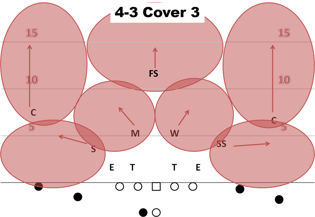 When he inherited the Wyoming defense he kept it the same 4-2-5 base, which is not optimal given the possible inclement conditions for the game this Saturday and a Cal 22 personnel run-heavy grouping. This 4-2-5 base relies on 2 defensive ends who won’t be dropping into space as much as in the past and add the aforementioned Seattle Cover-3 and Tampa-2, both of them schemes with the middle of the field closed (closed-ish with Tampa-2 where the MLB/ILB drops into the deep middle zone between the safeties who are in a Cover-2 look). The weakness of Cover-3 is the seams, see the space between FS and CBs (see below). Despite having 8 in the box (four DL, two LBs, and two DBs) the 2 DBs could be a weakness in the run game due to lack of size in run fits.