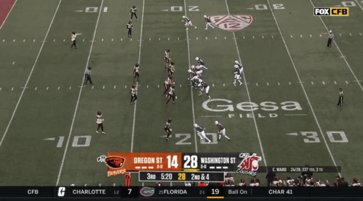 Ward’s biggest strength is his ability to buy time in the pocket and still keep his eyes downfield. Wazzu runs an Air Raid offense designed to spread the field, which means that given enough time, Ward will eventually be able to find an open receiver: