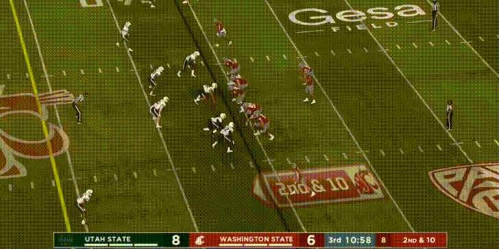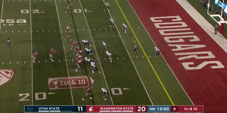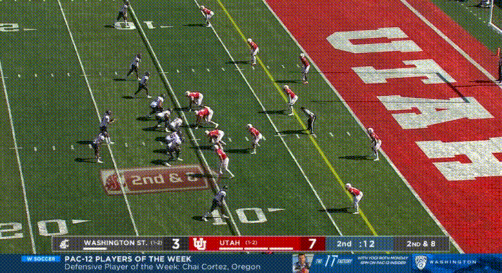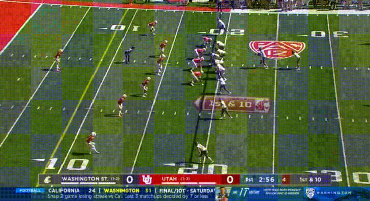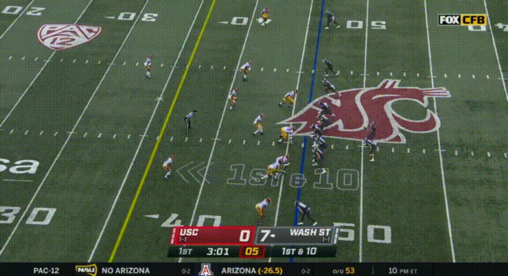 Washington State has a number of talented wide receivers, and yet somehow all of my highlights ended up being of Travell Harris. It was Travell Harris whose play kept having me say, “Wait, let me rewind that and watch it again.” Travell Harris is a fantastic wide receiver, and really the only knock against him is that he’s a bit undersized at 5’9”. Travell Harris’ explosiveness means that Wazzu uses him to return kicks/punts, and he’s often the receiver seeing action through jet sweeps or swing passes into the flat, where you give him the ball and wait for something to happen.