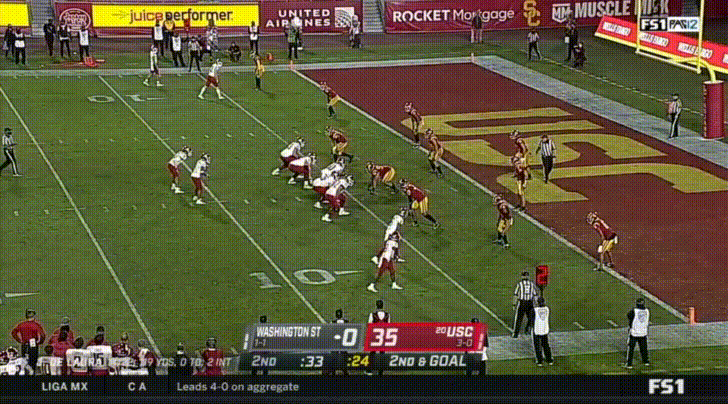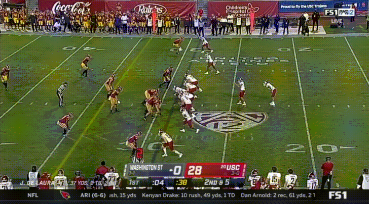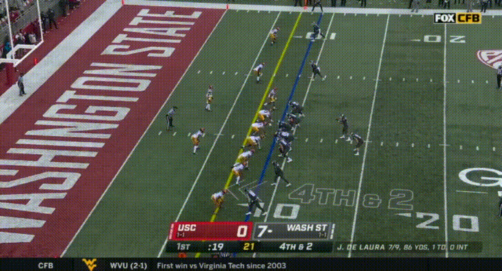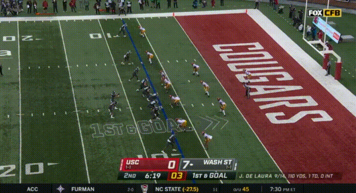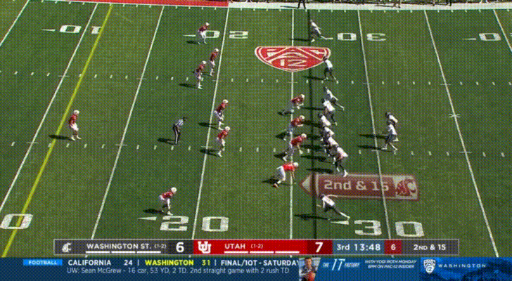 A lot of Wazzu’s passing attack is of the dink-and-dunk variety, but having the ability to take the top off the defense opens up the entire offense. Jayden de Laura can occasionally make a nice downfield pass: