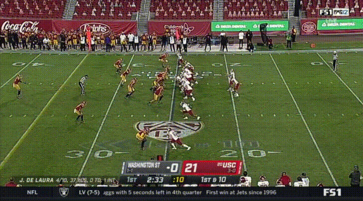 (Note: The following de Laura clips are from last season, but de Laura only played a half against USC and missed the Utah game, so I have limited material to pull from.) As I mentioned previously, de Laura did not always make great reads, and it was often costly: