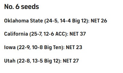 If I’m trying to be objective, I’d have Cal ahead of the following teams listed above: Utah (Cal has a better record against a tougher schedule), Florida State (ditto), and Creighton (zero quad 1 wins). And I’d have Cal behind the following teams: Iowa (more quad 1 wins, tougher schedule), West Virginia (Better best wins, tougher schedule), Michigan State (very close resume, tie goes to the team with the head-to-head win), and Louisville (better best win, better worst loss, better strength of schedule, head to head win).