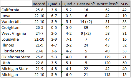But even then, the margin here is very slim. And the other four teams on the list? Almost impossible to parse. Should Vanderbilt get credit for playing more Quad 1 games, but losing all of them? Should Oklahoma State go ahead of Cal because they have better good wins, or behind Cal for having a couple of really ugly losses? Should Michigan’s better strength of schedule push them over the top when they have a bad loss as well? It’s a question of what you value, and I don’t know that there is a wrong answer.