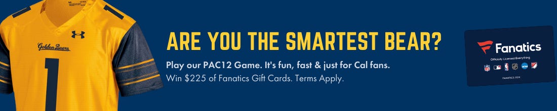 With only 5 weeks left in the season, make sure you are in on our Pac-12 Conference season challenge on Chancer. The top 3 players by the end of the season will win some Fanatics gift cards! Challenge yourself against the Cal community in how well you know Cal history and predicting Cal outcomes!