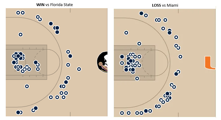 While Kyle was winning the interior battles, Cal could not answer on the perimeter. Miami’s defense wasn’t doing anything special against Lulu Twidale and Cal’s shooters. Cal was getting their typical shot looks; the shot just weren’t falling Cal shot 8-of-33 (24%) from outside, well below their season average. Cal shot 22-of-66 overall (33%).